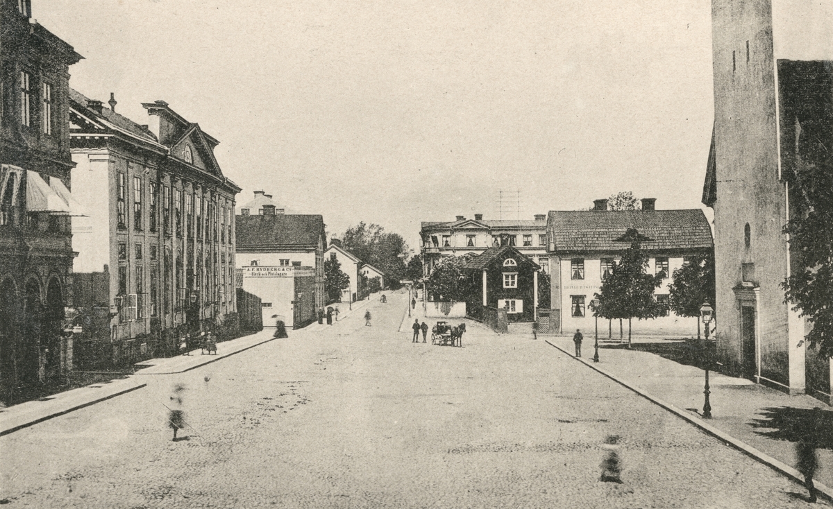 Brevkort med ålderdomlig linköpingsvy. Den öppna ytan kallades vid tiden Sankt Larstorget. I än äldre tid benämnt Landskyrkotorget med anledning av dess läge invid landsförsamlingens kyrka, Sankt Larskyrkan som skymtar i höger bildkant. Snett mittemot kyrkan reser sig Linköpings gamla teater, Assemblé- och spektakelhuset.