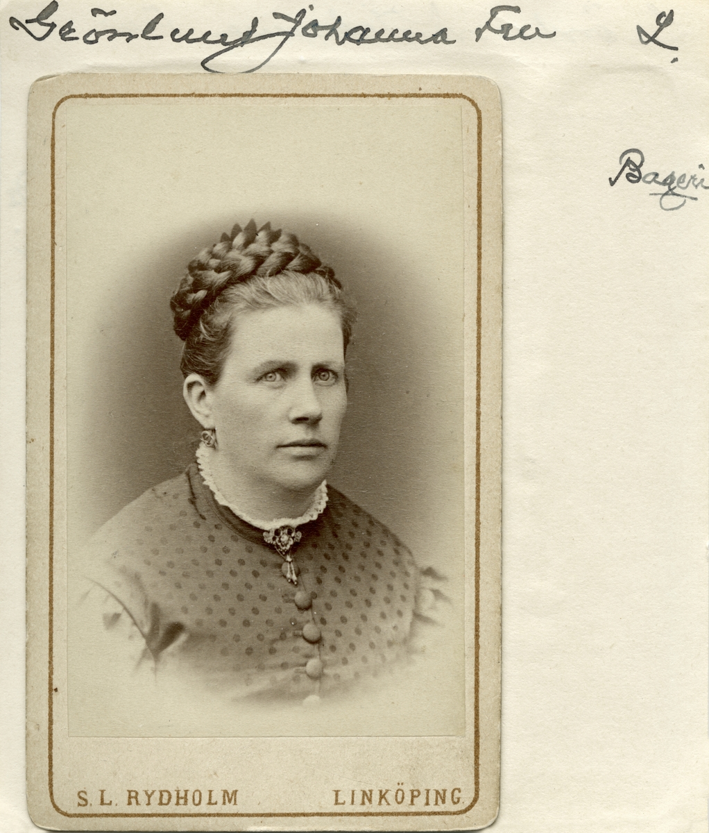 Porträtt av Johanna Grönlund, född Jacobsson. Från 1859 gift med bagarmästaren i Linköping, Per Adolf Grönlund. Änka i mars månad 1886.