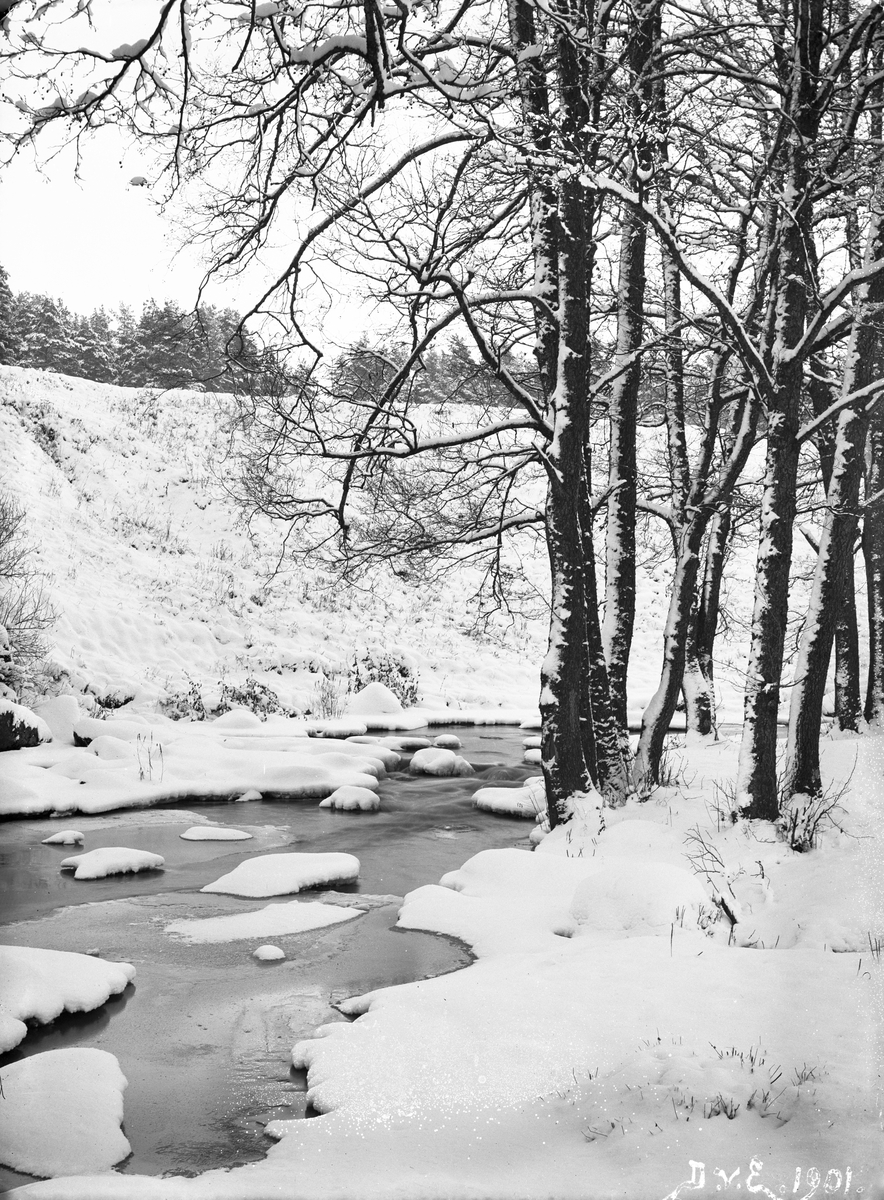 Tinnerbäcken i vinterskrud. Motiv som rimligtvis tagits som inspiration och förlaga för fotografens konstnärsskap som landskapsmålare. Den exakta platsen har inte lokaliserats.