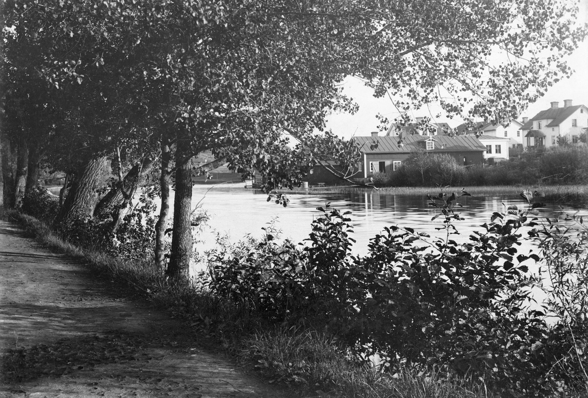 Motiv från Linköping kort före förra sekelskiftet. Vy från Östra Strandpromenaden mot bebyggelsen utmed Styrmansgatan i stadsdelen Hejdegården.