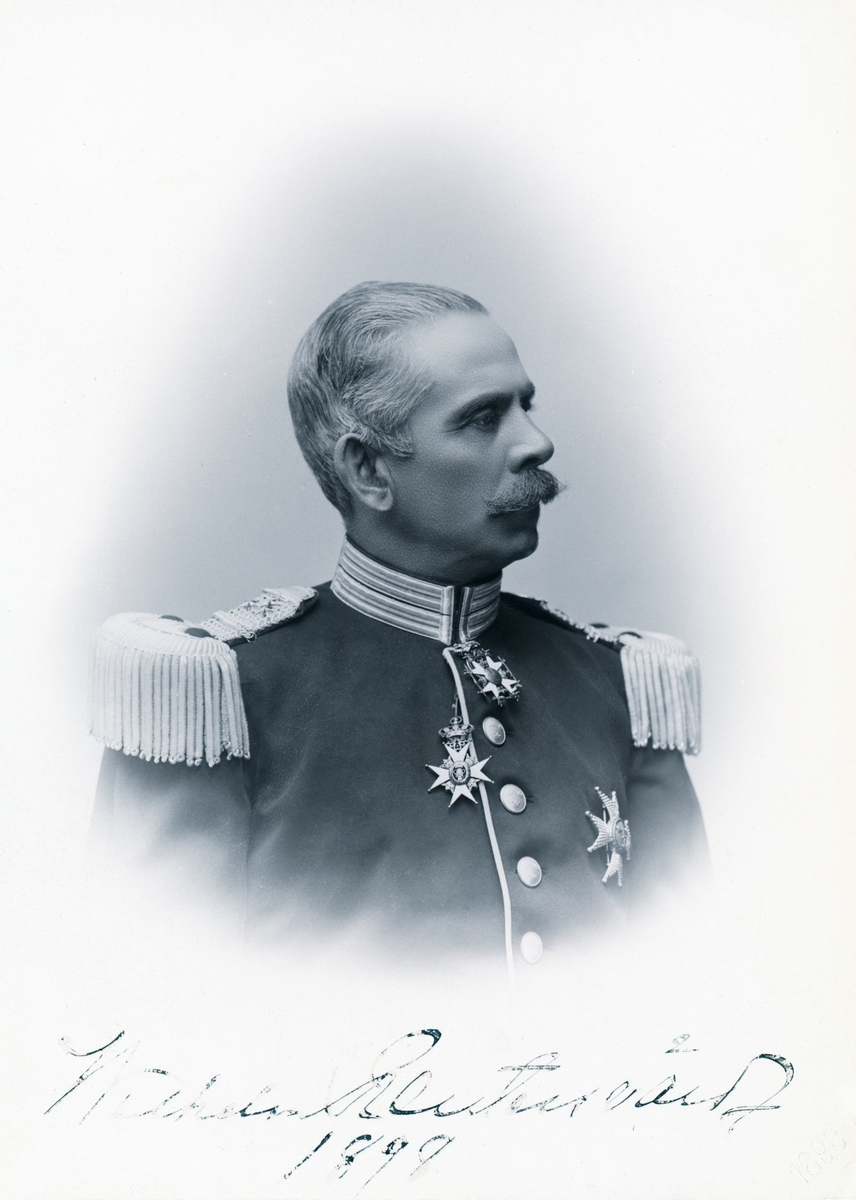 Porträtt av överste Wilhelm Reuterswärd. Född 1837 på Rotenbergs säteri i Östra Stenby socken som son till Anders Wilhelm Reuterswärd och Augusta Fredrika Elisabet Valt von Steijern. Från 1869 gift med Carolina Adelaide Brändström, efter hennes död 1875 omgift med Johanna Beata Karolina af Robson. Han inledde sin militära karriär som furir vid Närkes regemente 1854. Avancerade i rang genom åren till att år 1890 bli överste och chef för Västgötadals regemente och Första livgrenadjärregementet i Linköping samma år.