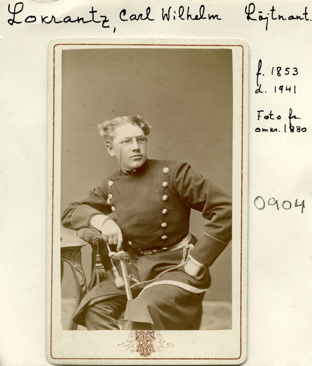 Porträtt av Carl Wilhelm Lokrantz. Volontär vid Andra livgrenadjärregementet i Linköping från 1872. Efter Krigsskolan kom han åter till regementet för en militär karriär som nådde honom kaptens grad vid avskedet 1905. Han tjänstgjorde även som lärare vid Lunnevads folkhögskola under åren 1876-1894 och som verkställande direktör för Östgöta Enskilda Banks avdelningskontor i Norrköping under åren 1898-1909. Från 1885 gift med Alfhild Karolina Borneman.