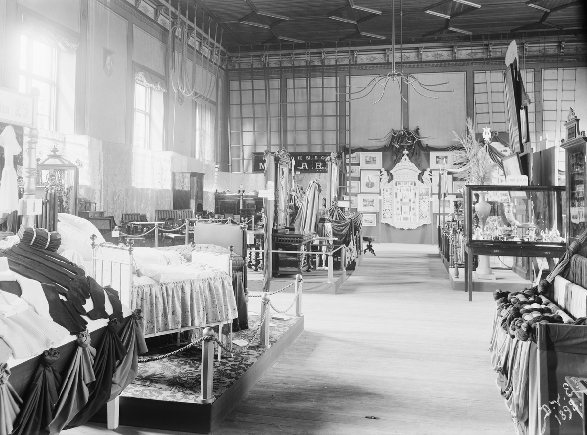Vid sidan av 1898 års lantbruksmöte i Linköping anordnade stadens hantverkareförening en industriutställning i och utanför läroverkets gymnastiksal. Tidningen Östgöten meddelar att utställningen omfattade "jemnt 60 nummer", såväl från länets städer som landsbygd. Bilden visar prov på de stilideal som rådde i landsorten runt förra sekelskiftet, där en traditionell formuppfattning ännu efterfrågades. Mot väggen i fonden gör fotograf Swen Swensson reklam för sina alster.