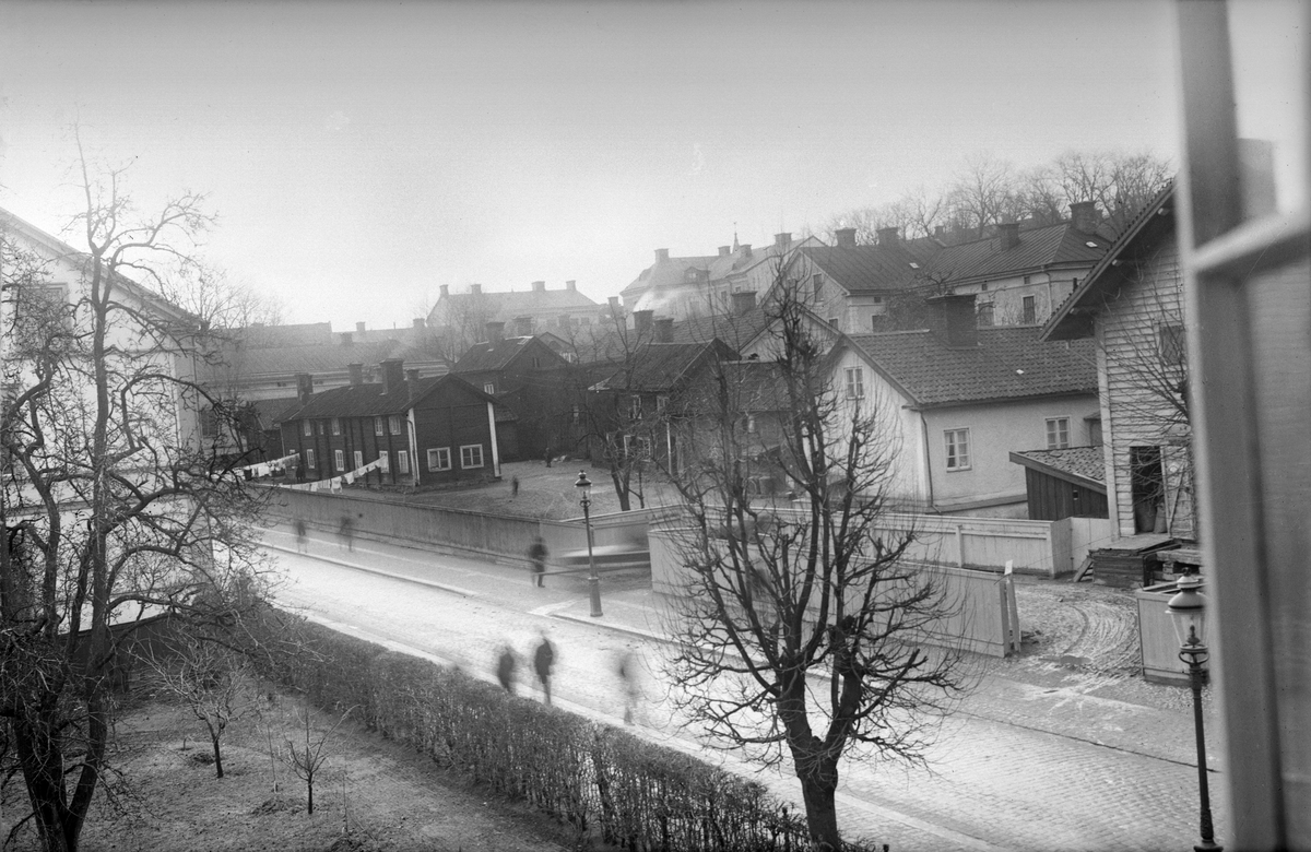Del av Platensgatan i Linköping och miljön utmed kvarteret Absalon i en skepnad som näppeligen ingen nu levande kan minnas. Fotoåret 1925 stod husen inför rivning för att ge plats för arkitekt Björn Hedvalls eleganta bostadshus, inflyttningsklart 1928.