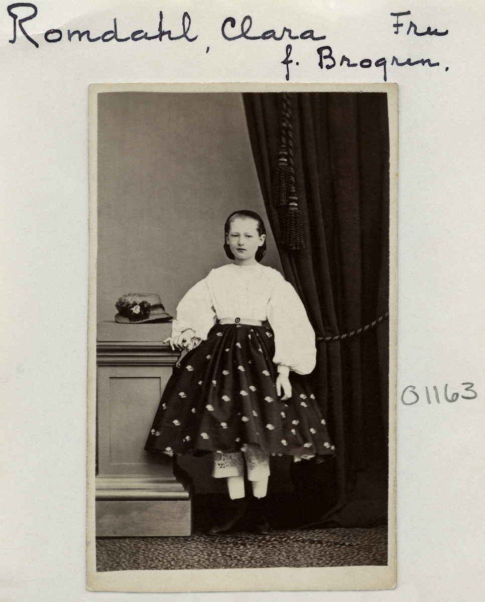 Porträtt av Clara Brogren. Född 1852 i Kisa och dotter till apotekare Ludvig Theodor Brogren och Josefina Catharina Theresia Brogren. Från 1879 gift med rektor Axel Romdahl.