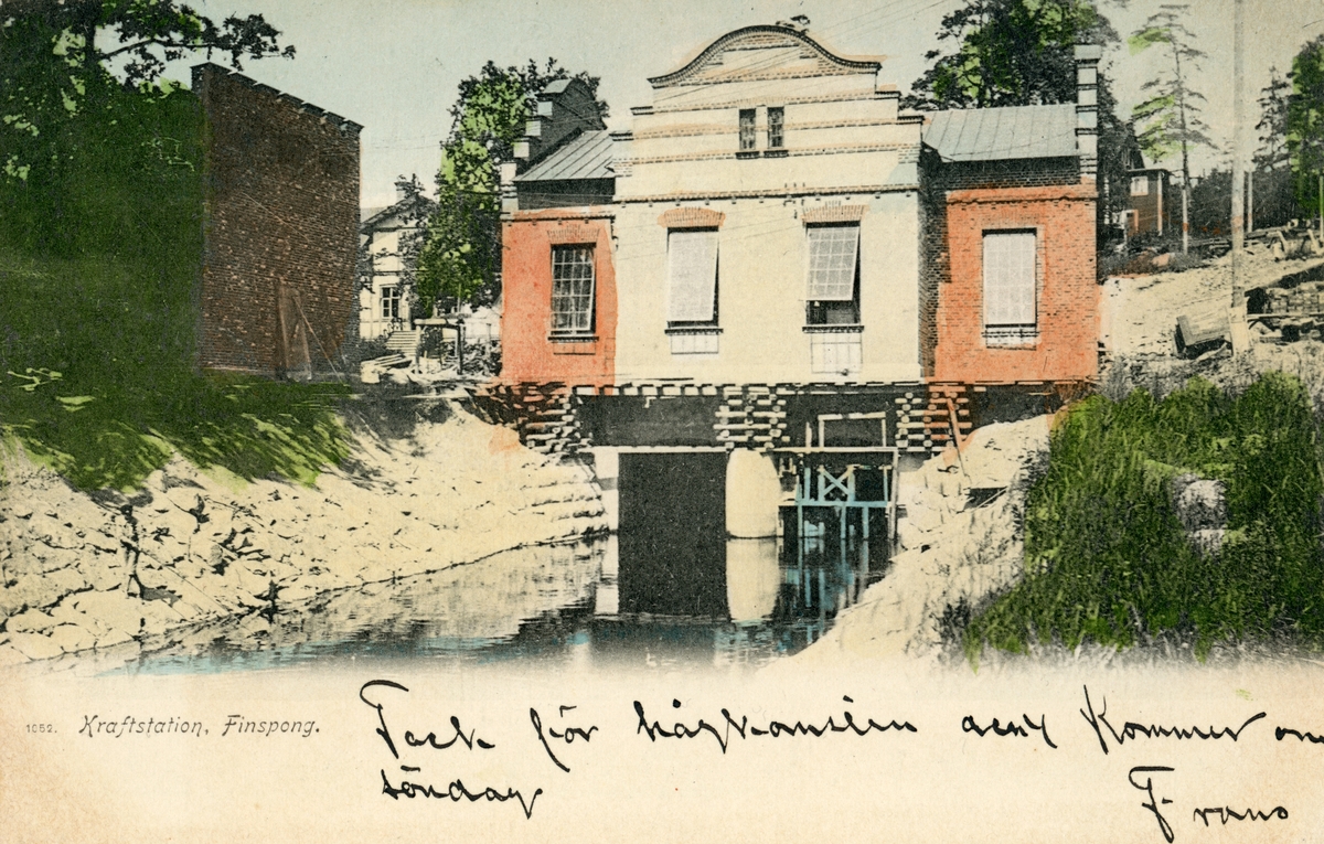 Finspångs kraftstation uppfördes av AB Finspångs Styckebruk i Finspångsån under åren 1901-02. Här anläggningens nedströmsfasad genom ett kolorerat brevkort från tiden omkring färdigställandet.