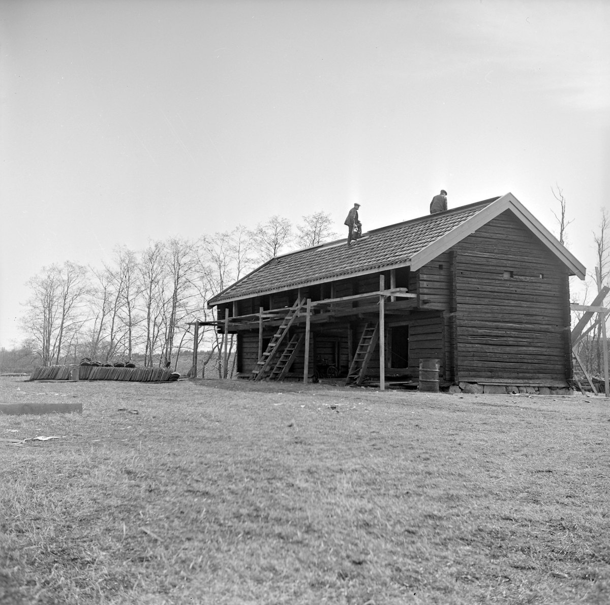 Åsens loftbod under återuppförande i Mjölby hembygdsgård 1938. Boden stod ursprungligen vid hemmanet Åsen i Västra Harg och uppges där varit rest år 1779.