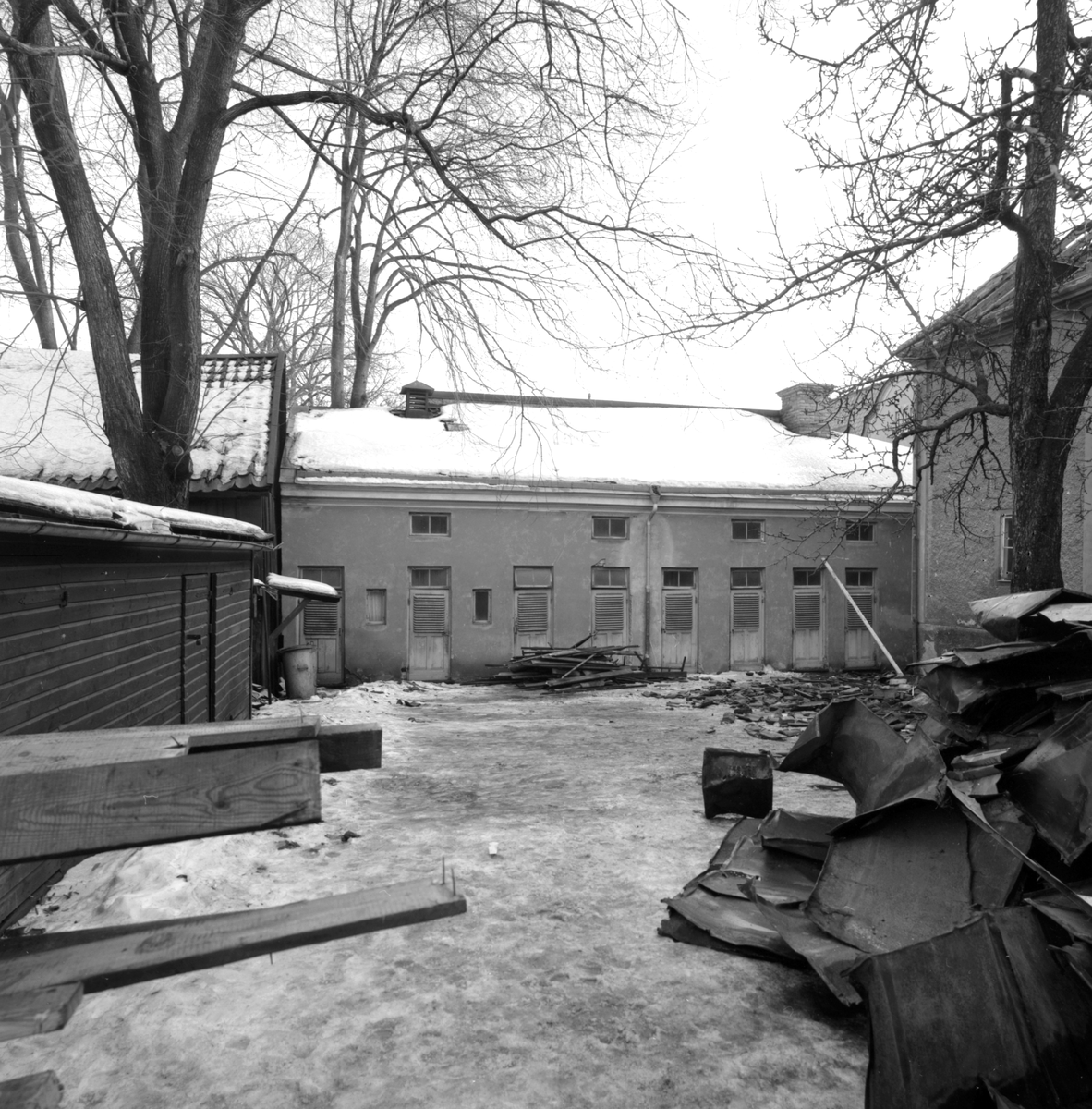 Under 1966 revs närmast all äldre bebyggelse i kvarteret Ambrosia för att ge plats för det planerade nämndhuset. Diskussionen stod hög och resulterade i att den så kallade Barkmanska gården flyttades till Gamla Linköping och att Hagdahlska dito fick stå kvar. Bildens uthuslänga var det nog ingen större debatt kring.