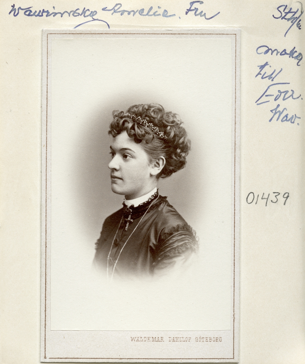 Porträtt av fru Amelia Wavrinsky. Född Bark i Göteborg som dotter till snickarmästaren August Bark och Henrika, född Peterson. Från 1873 gift med mångsysslaren Edvard Wavrinsky, inte minst ihågkommen för sina insatser inom freds-och nykterhetsrörelsen. Det barnlösa äktenskapet upplöstes formellt 1886 men Amelia hade då varit boende i sitt föräldrahem en längre tid. Hon fortsatte sitt liv som ensamstående i Göteborg till sin död 1913.