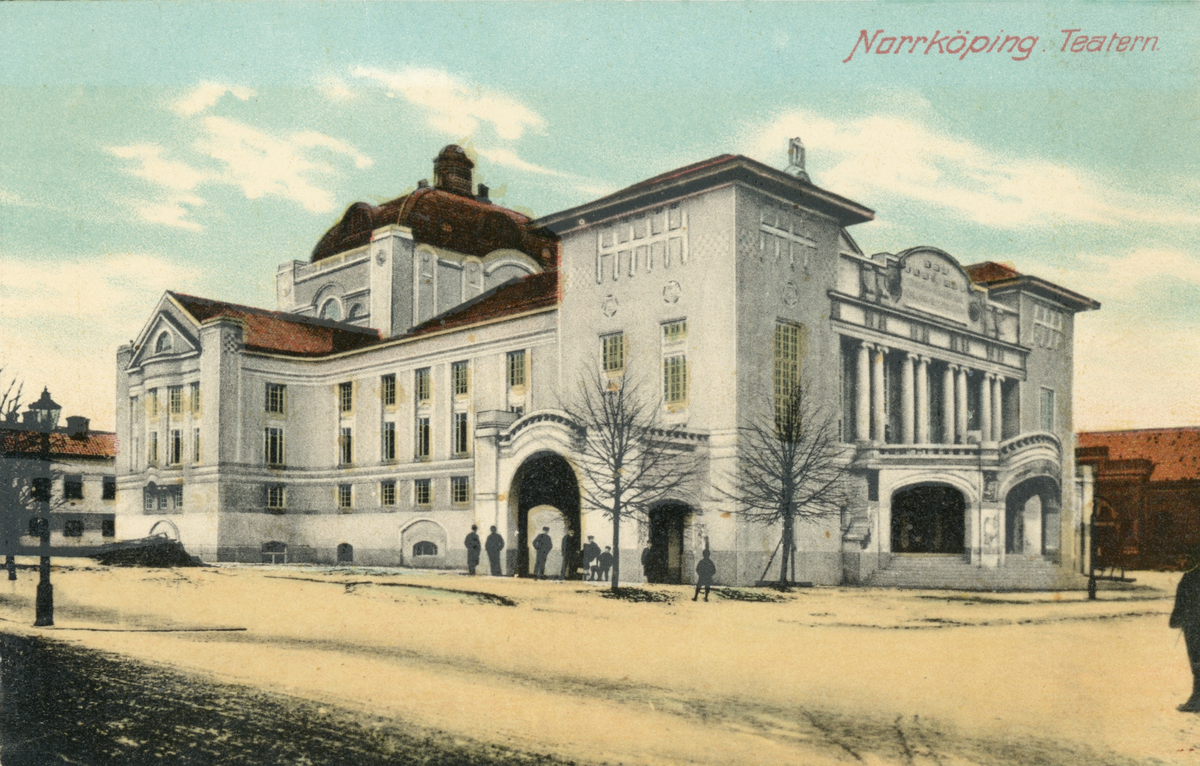 Kolorerat brevkort med vy mot Stora teatern i Norrköping. Byggnaden stod färdig 1908 och uppfördes efter ritningar av arkitekt Axel Anderberg. Teaterbyggnaden ersatte ett äldre teaterhus som rivits 1905 för att på samma plats ge utrymme för Andersbergs jugendinspirerade nöjesetablissemang.