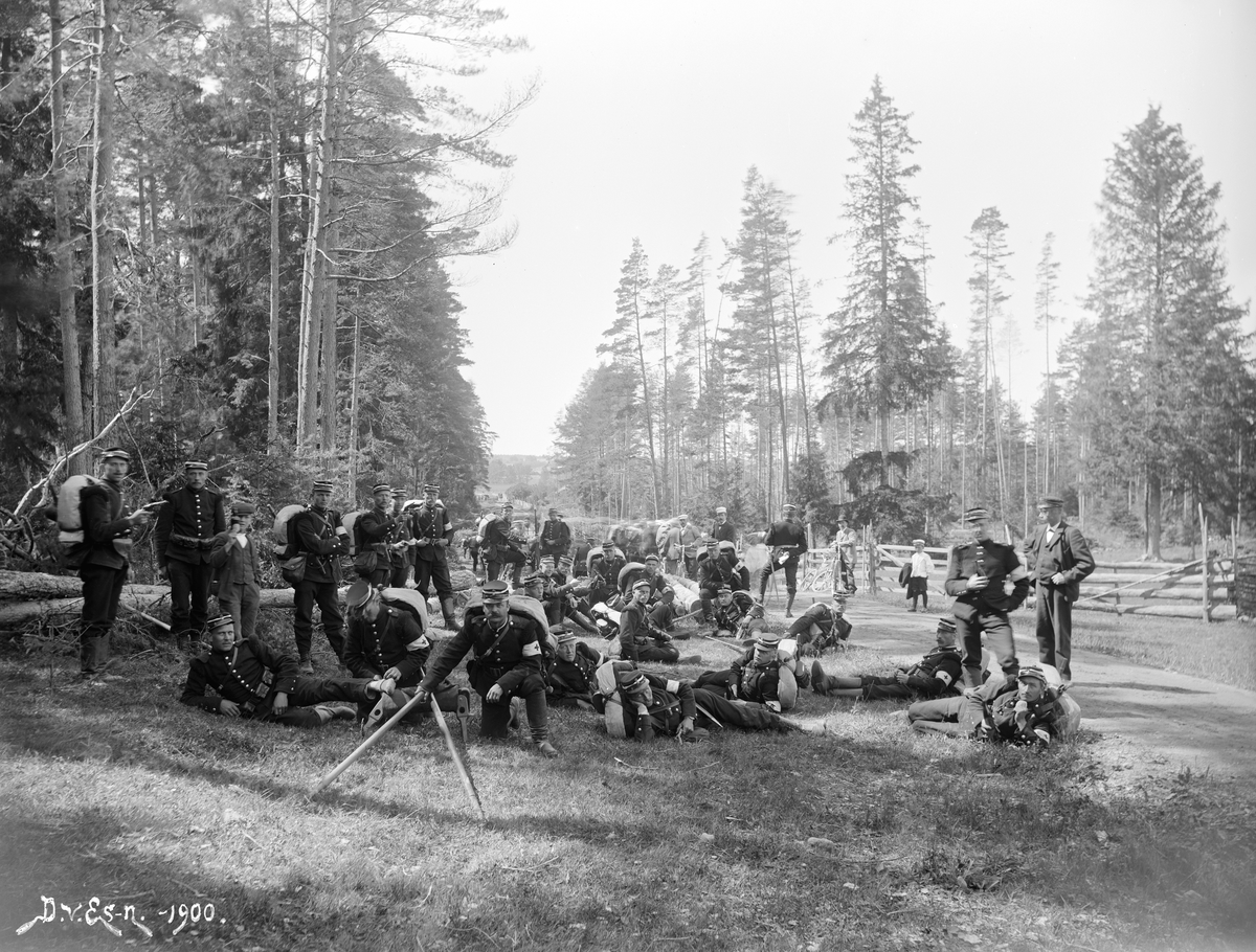 Genom fotografens anteckningar får vi veta att vi betraktar eftertruppen av sjukvårdssoldater vid mobiliseringsövning år 1900. Vidare förmedlas att gruppen i stunden nått Naterstad i Slaka socken på sin väg mot Malmens övningsfält.