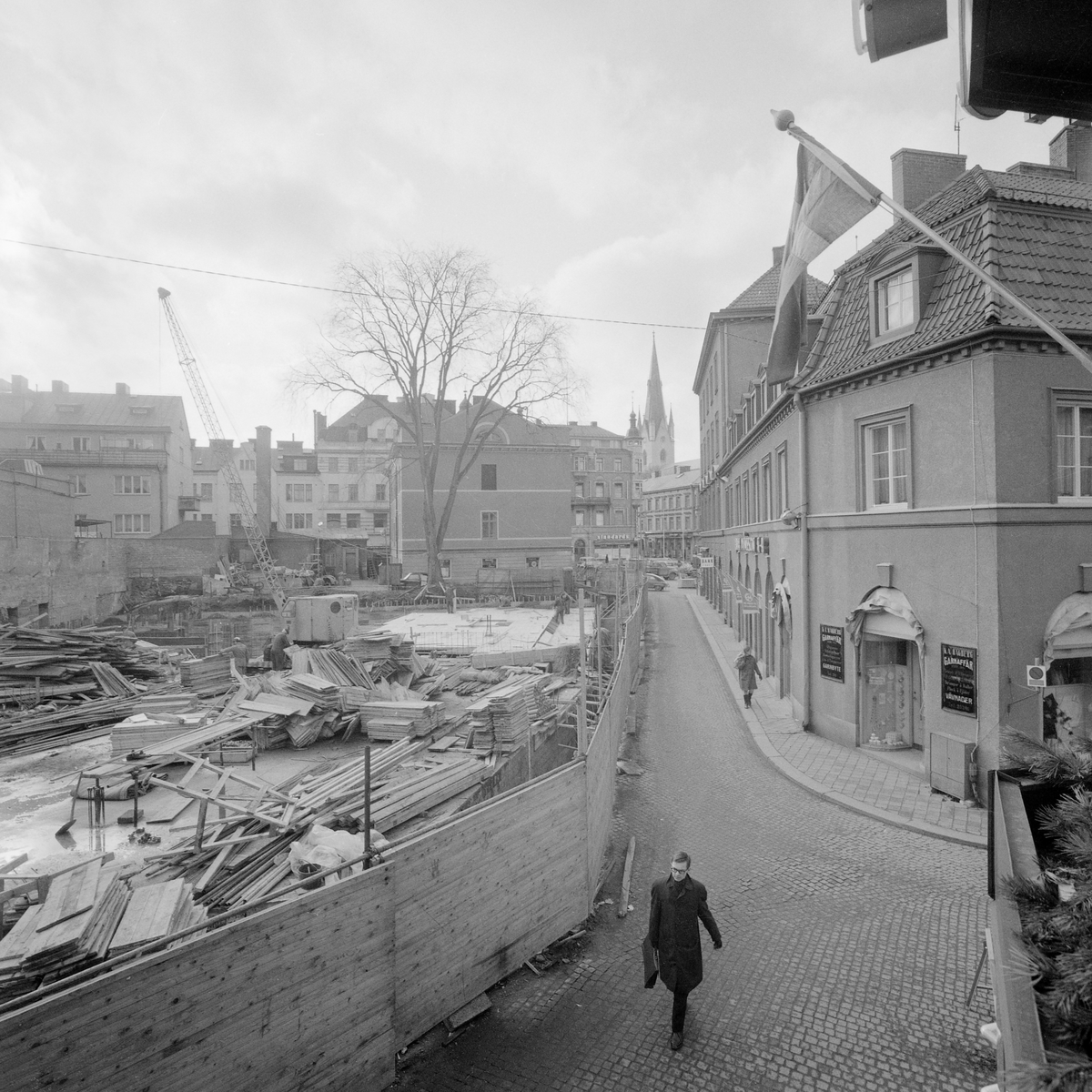I mitten av 1960-talet revs det mesta av den återstående träkåksbebyggelsen inom kvarteret Domaren i Linköping. Lyckligtvis skonades det så kallade Berget till vänster utanför bilden. Fotografiet visar grundläggningsarbetet för det nya affärshus som planeras.
