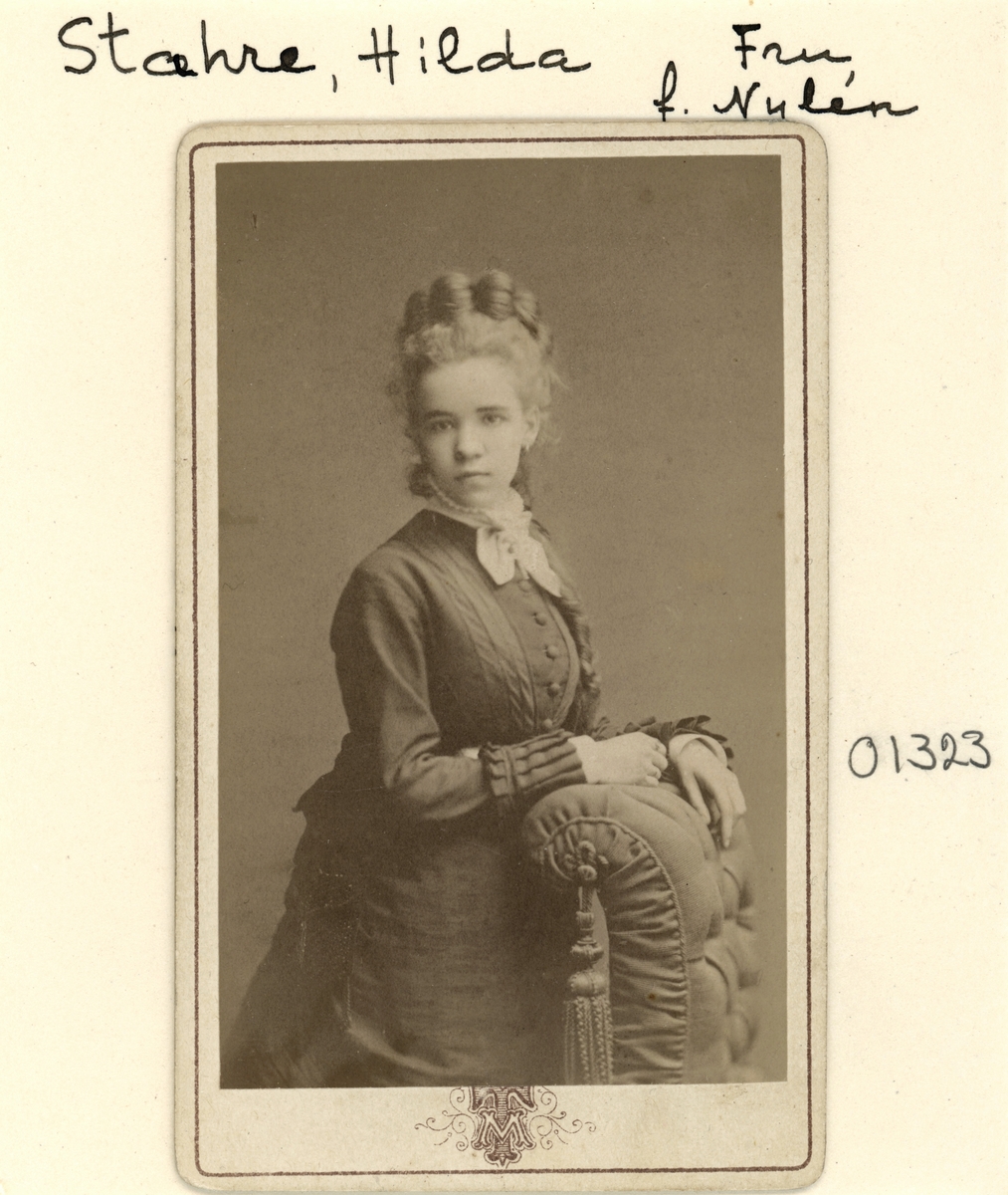 Ungdomsporträtt av Hilda Nylén. Född i Linköping 1857 som dotter till fanjunkaren och musikföreståndaren Carl Johan Nylén och makan Sofia Wilhelmina Clairström. Från 1885 gift med bokhandlare Robert Wilhelm Stahre.
