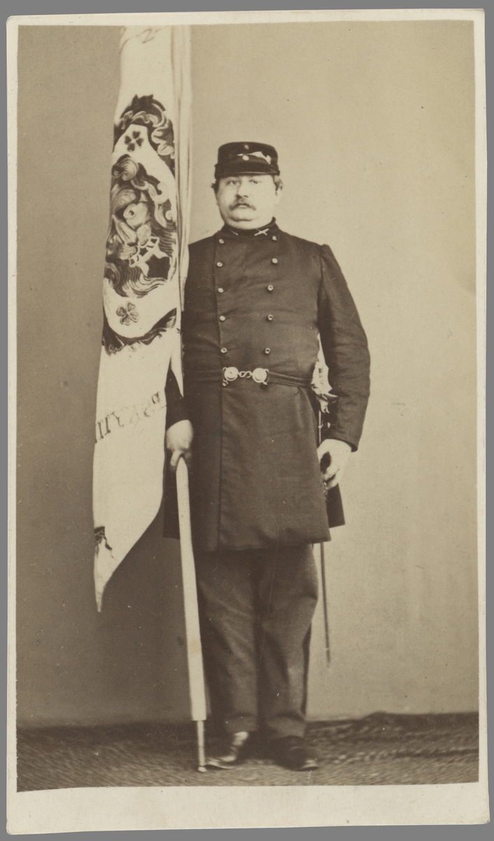 Porträtt av hypotekskamrer Wilhelm Goës. Här iförd Linköpings frivilliga skarpskytteförenings uniform. Född i Rök kom han till Linköping 1852 för anställning vid Östgöta hypoteksförening. Han avled ogift 1882.