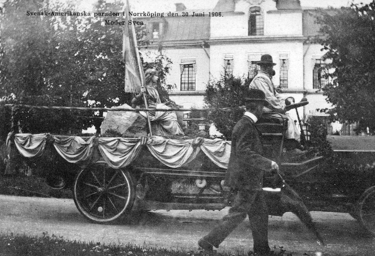 Konst- och industriutställningen i Norrköping 1906 omfattade en mängd aktiviteter vid sidan av mer självklara inslag. Ett av dessa gick av stapeln den 30 juni som gav utrymme för en svensk-amerikansk dag. Som final i firandet gick man i kortege utmed Drottninggatan. Brevkortets motiv visar ett av ekipagen, ett motordrivet, där Moder Svea manifesteras. I stunden passeras Villa Swartz vid Södra promenaden, möjligtvis på väg till eller ifrån det egentliga firandet.