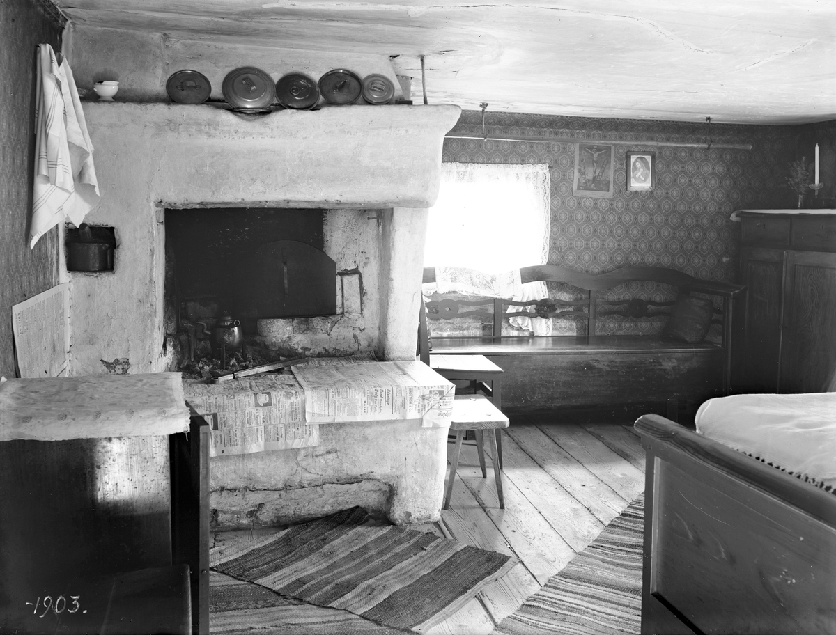 Interiör från dåvarande Djurgårdsgatan 13 i Linköping. Stugans enda rum fick inrymma hushållets alla funktioner. Här umgicks man, åt och sov på det vis som merparten av invånarna erbjöds i stadens mer ruffiga utkanter. Gårdstomten adressändrades 1921 till Djurgårdsgatan 5, och blev vidare del av det busstorg som kom att läggas ut på 1940-talet.