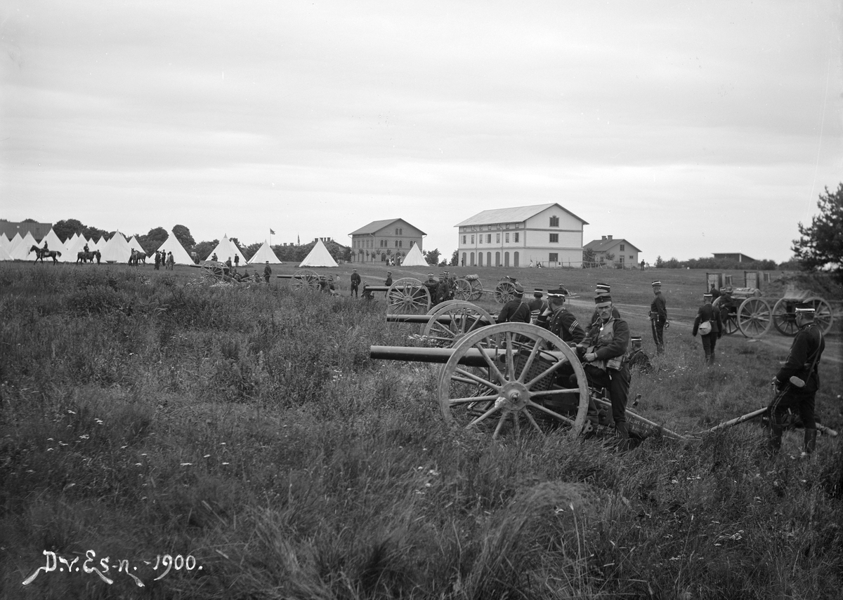 "Batteriet å Malmslätt" lyder fotografens beskrivning av motivet. En smula efterforskningar ger vid handen att vi bevittnar Andra Göta artilleriregementets övningar på Malmens övningsfält väster om Linköping. Sammanhanget är den mobilisering som utfärdades år 1900.