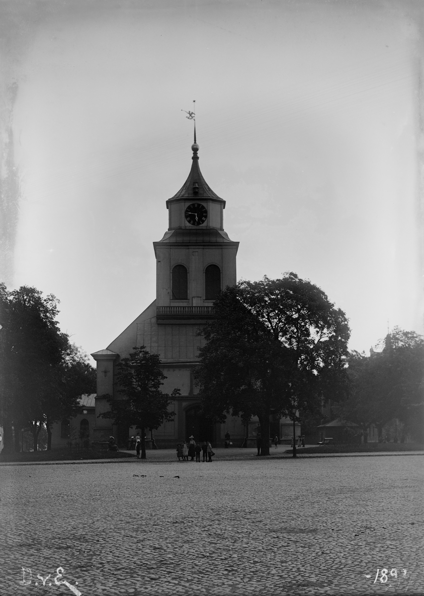 En något fördunklad vy mot Hedvig kyrka invid Tyska torget i Norrköping. Kyrkan uppfördes under 1670-talet av stadens tyska församling och har historiskt även benämnts Tyska kyrkan.