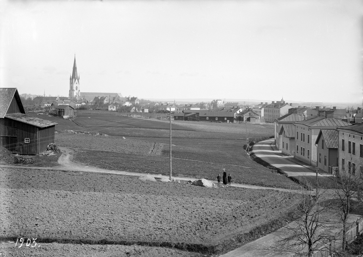 Ett sällan sett panorama mot Linköping. Vy mot norr från fotografens bostad utmed Djurgårdsgatan. Året är 1903 och ännu kallar man den ringlande leden Djurgårdsvägen. Närmast till höger växer arbetarstadsdelen Stolplyckan fram med enkla bostäder för att möta tidens stora inflyttningen till staden. Stadsjorden till vänster är som synes närmast obebyggd och brukas ännu på lantmannavis. I fonden själva staden med ett antal igenkännbara byggnader.