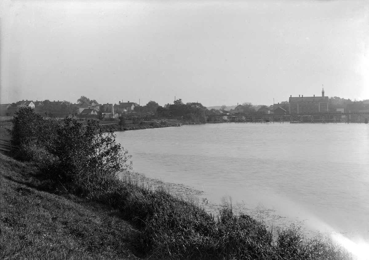 Ett av tiden grumlat motiv från Linköping där orienteringen inte är uppenbar utan vägledning. Kameran stod uppställd på Stångebro-sidan mitt emot hamnområdet och var riktad rakt söderut. Framför husgruppen till vänster skymtar Stångebromonumentet. Fabriksbyggnaderna till höger tillhörde vid tiden Brogrens bryggeriaktiebolag, föregångare till det mer bekanta Centralbryggeriet. Odaterad bild från omkring förra sekelskiftet.