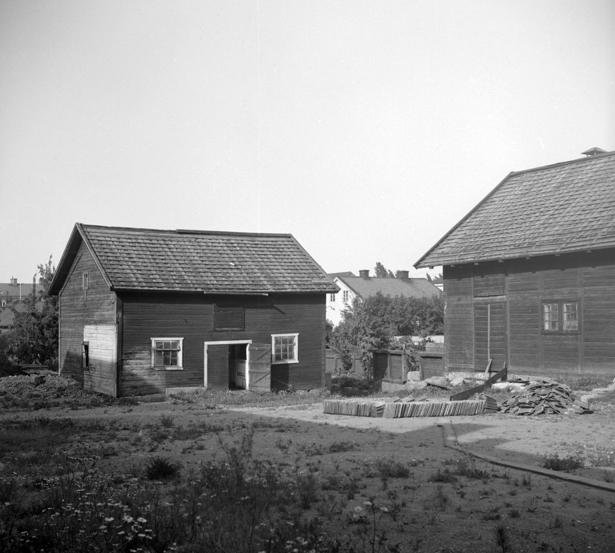 Från biskopens bakgårdar i Linköping. Biskopsgårdens vida tomt har genom åren givit plats för åtskilliga hus vid sidan av själva bostället. Här ett nedslag från 1938. Vy närmast mot norr.