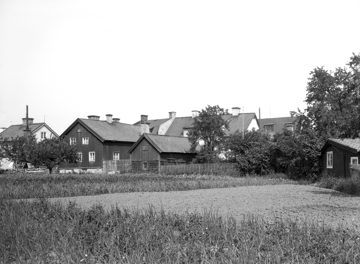 Bakside-vy mot Hunnebergsgatan i Linköping. I blickfånget gårdssidorna av dåvarande fastigheterna Hunnebergsgatan 12 och 14. Vid tiden för bilden var Brunnsgatan ännu inte utlagd. I förgrunden till höger ses en skymt av ett hus i en grupp som låg utmed Östgötagatans parti som tidigare benämndes Kattbrunnsgatan.