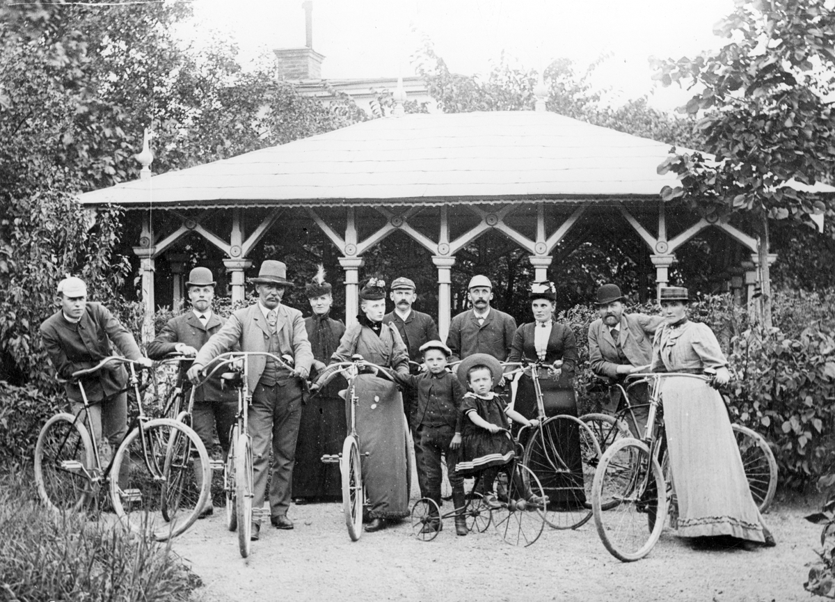 Cykelutfärd 1901 med en parad av tidens åkdon för både stora som små. Platsen är Grand Hotells trädgård i Linköping. Utöver detta får vi veta att sällskapet är danska undersåtar. Det får sin förklaring i den identifierade ynglingen länst till vänster. Han heter Johannes Peterzén och är född i Danmark 1869. Med tiden kommer han att bli grosshandlare staden och även vice konsul.