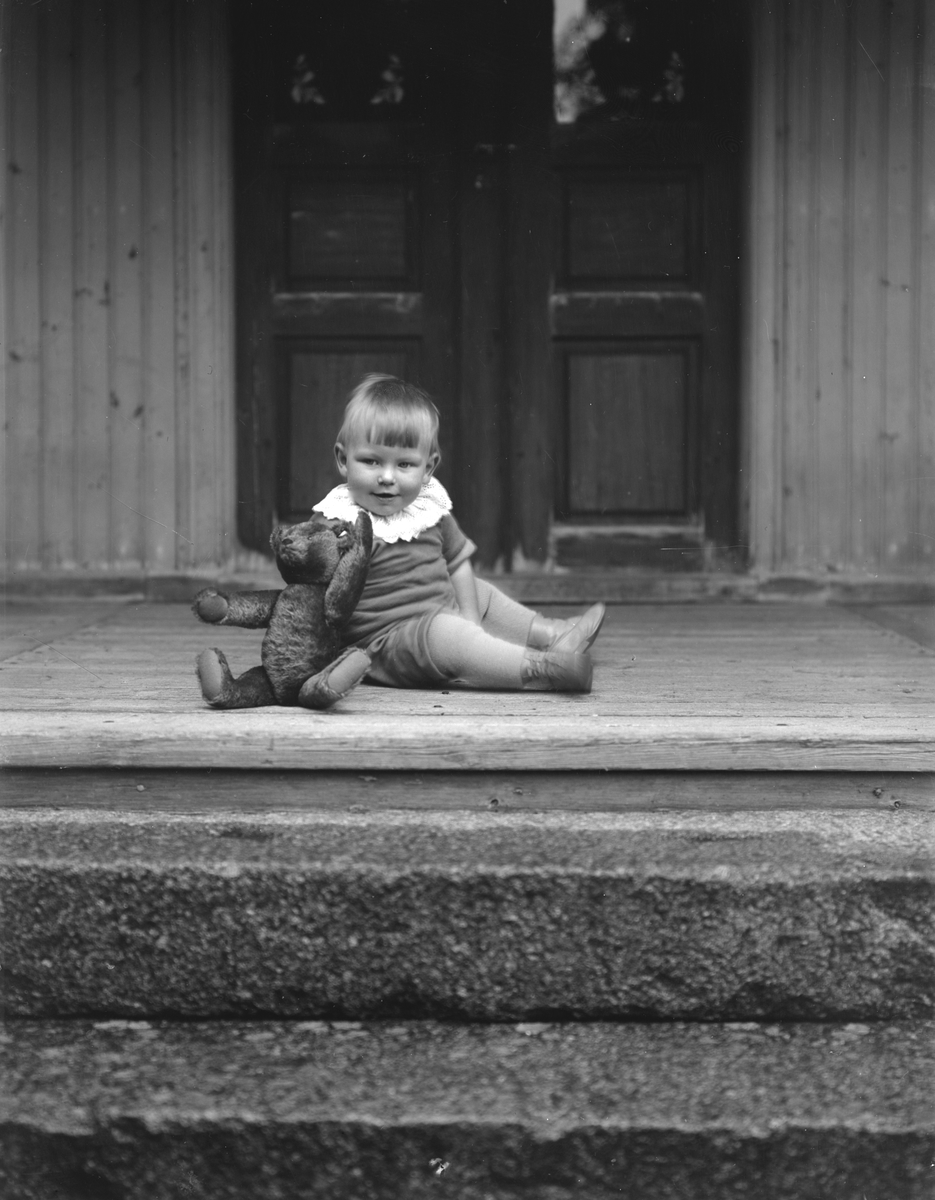Åke Lindgren med sin älskade nalle på trappan till Födekulla i Svinhult. Vid tiden för bilden arrenderade föräldrarna gården. Åke blev dock faderslös i sjuårsåldern och familjen bröt upp och flyttade till Ingatorp 1935.