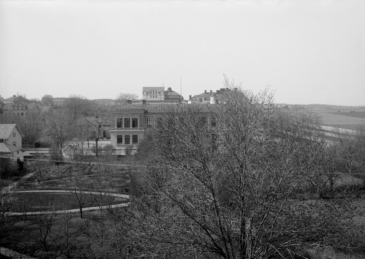 Linköpingsvy som utifrån andra, sannolikt samtida, tagningar kan dateras till 1906. Vy från Lithografens då nya anläggning med kameran vänd rakt västerut. Närmast ses stadens flickskola, Elementarläroverket, som döljer Brandstodsbolagets kontor och skymmer den år 1903 invigda teatern. På tomten i förgrunden kom vidare Frimurarehotellet att uppföras, invigt 1912.