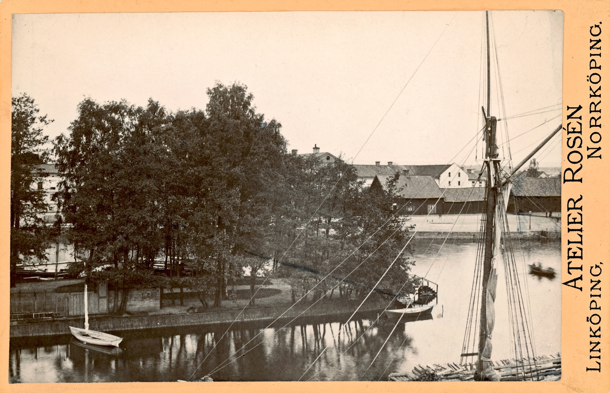 Motala ström i Norrköping med Strömsholmen i förgrunden och Saltängen i bakgrunden. På den här sidan ön kommer Norrköpings Roddklubbs båthus byggas 1932. På andra sidan strömmen syns kanontorget och kvarteren Nunnan, Munken och Jungfrun. Vykort. Vy mot nordost.