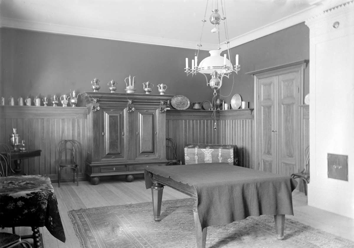 Interiör från Brändströmska gården i Linköping, uppkallad efter överste Edvard Brändström som under några år kring förra sekelskiftet bodde här med sin familj. Just detta rum var som synes sparsamt möblerat och gav svängrum runt det biljardbord som vi får förmoda döljer sig under filten. På hamburgerskåpet och längs bröstlisten står kannor som minner om familjens tidigare tid i Ryssland, där Edvard varit militärattaché. Bild från omkring sekelskiftet 1900.