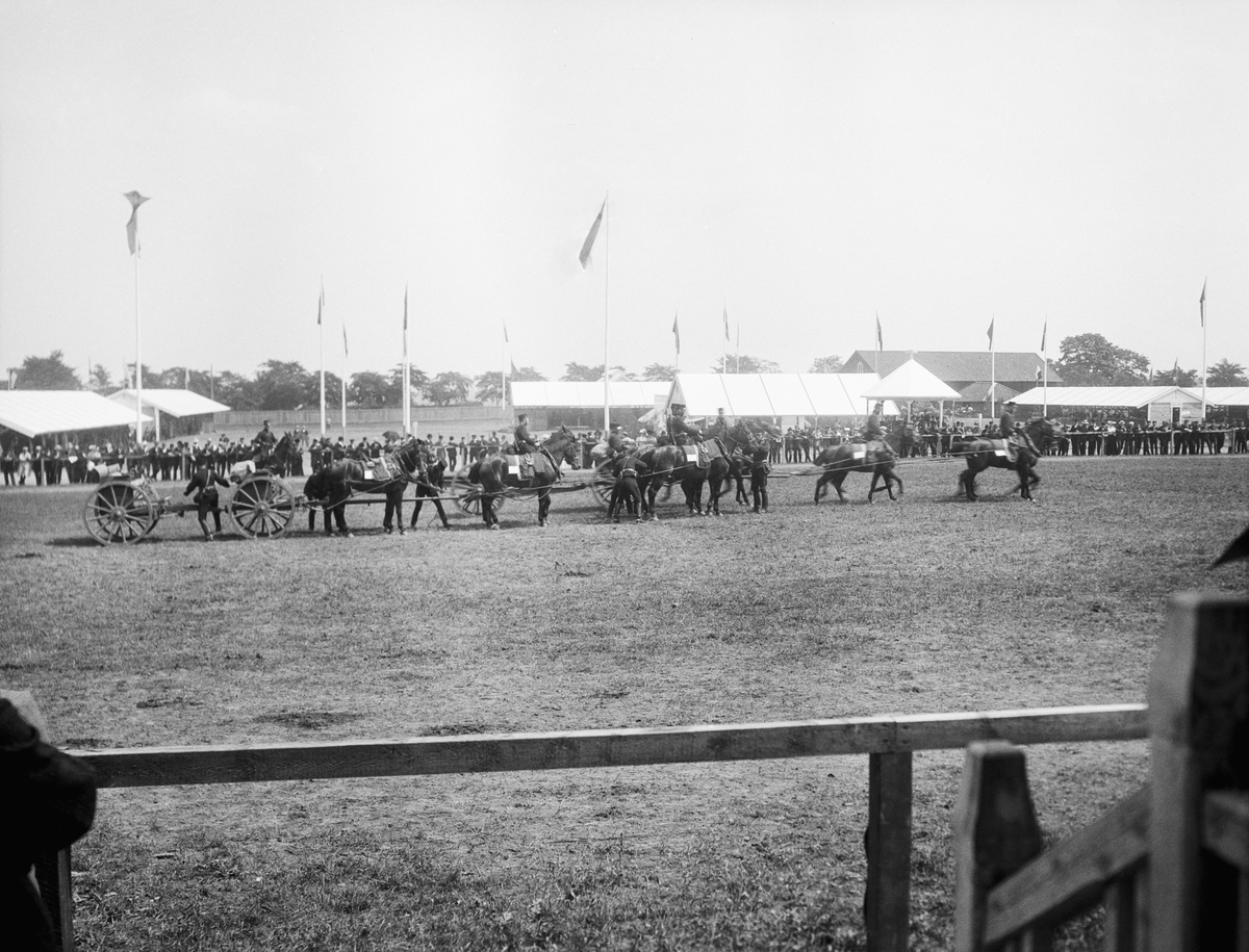 Smålands artilleriregemente med ett imponerande spann för tung transport. Bild från 1906 års allmänna svenska lantbruksmöte i Norrköping.