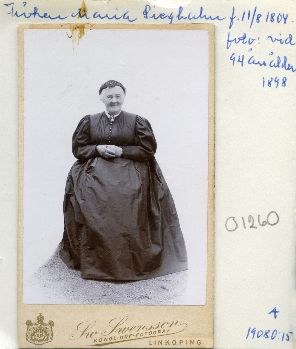 Porträtt av fröken Maria Siegbahn. Född i Ölmstad församling 1804 som dotter till ingenjören tillika skolinspektorn Clas Erik Siegbahn och makan Anna Christina Liedbeck. Från november månad 1822 finner vi henne som demoiselle i häradsprosten Sandvalls hushåll i Järsnäs prästgård. Redan påföljande vår flyttade hon till Adelöv där kyrkoherdeparet Liedzén-Brun öppnat sitt hem. Därefter följde ett par decennier med liknande uppehällen på platser i Jönköpings län som här inte är platsen att närmare redovisa för. Vi stannar istället till vid nådens år 1847. Först då fick fröken Siegbahn östgötsk anknytning när något fick henne att som mamsell ta tjänst vid Renstad säteri i Svanshals. Nästa anhalt i länet för Maria blev Ödeshög där en yngre bror arrenderade Hedins färgeri, följt av flytt till ännu en bror, denne kyrkoherde i Skeda. Man skrev då år 1863 och här blev hon kvar tills broderns död 1892 och därmed tvingades hon flytta från tjänstebostaden. Sina sista år i livet tillbringade hon i Linköping. Där avled hon den 25 april år 1900.