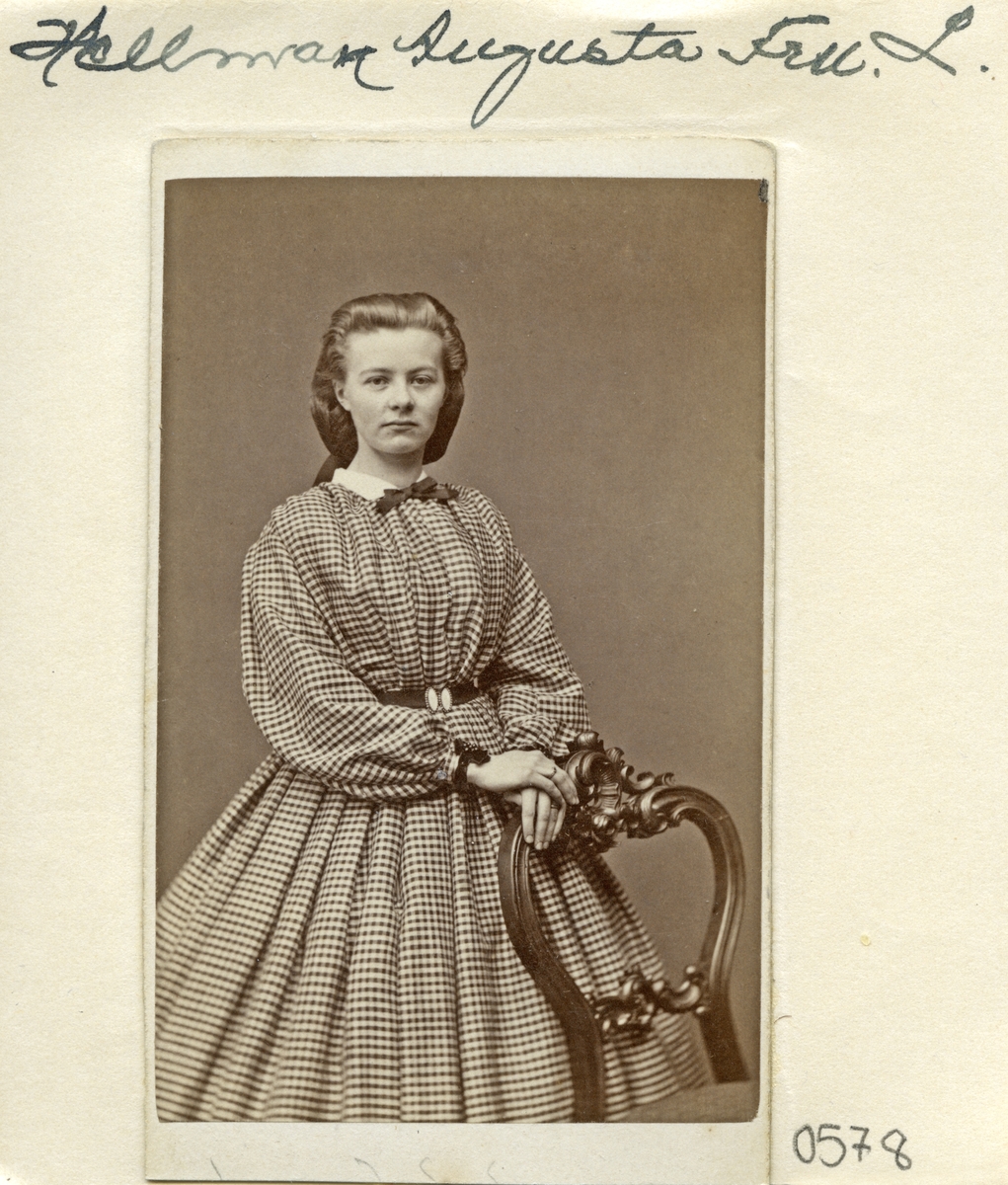 Porträtt av Augusta Enelius. Gift 1864 med skogsförvaltaren vid Adelsnäs egendom i Åtvidaberg, Anders Leonard Hellman. Änka i april månad 1880, vartefter hon flyttade till Brostugan under Adelsnäs. År 1901 inflyttade hon till Linköping och blev där till 1913, då hon utflyttade till Halmstad. Hon avled där året därpå.