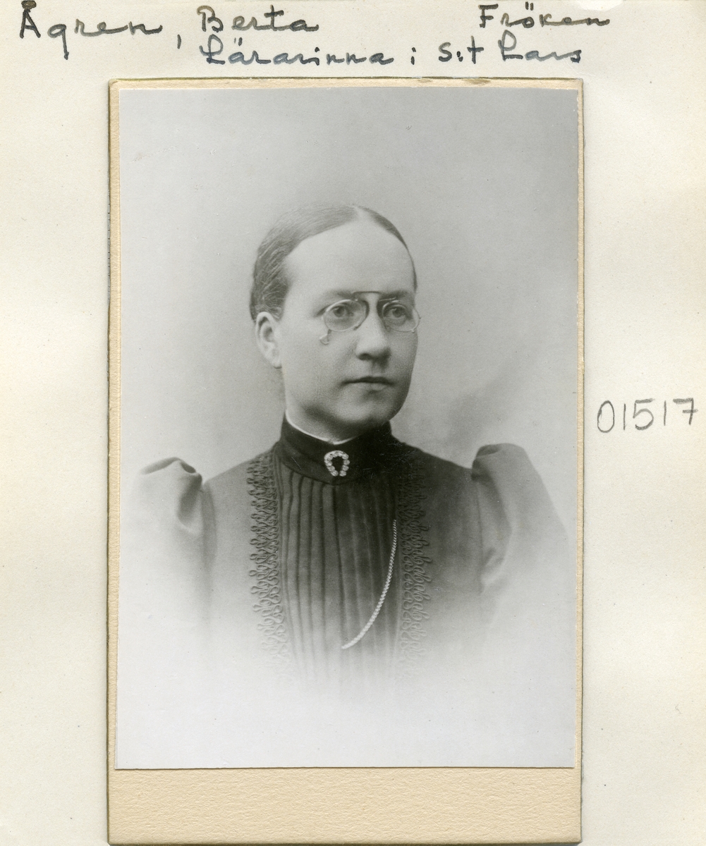 Porträtt av småskolelärare Berta Ågren. Det första avtrycket som lärare, inom ramen för denna uppgift, noteras 1881. Nämnda år inflyttade Berta från födelsestaden Skänninge till Vårdnäs socken, för att där ta tjänst som så kallad ersättningslärarinna vid skolhuset i Sätra. Året därpå flyttade hon till Linköpings landsförsamling Sankt Lars för nytt uppdrag i skolhuset Sätersholm i Mörtlösa. Här torde hon funnit sig väl, ty hon blev skolan trogen i 25 år. Inför höstterminens start 1907 bröt hon emellertid upp och kom under sina sista tio år som lärare att vara knuten till skolhuset Britenborg i Tannefors.