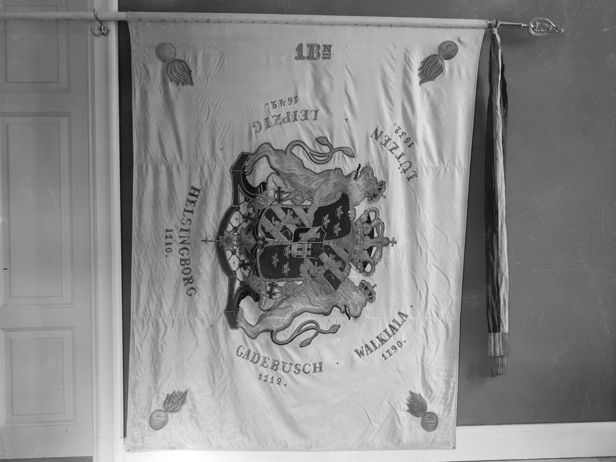 Östgöta kavalleriregementets fana med Stora Riksvapnet. Odaterat foto från omkring förra sekelskiftet.