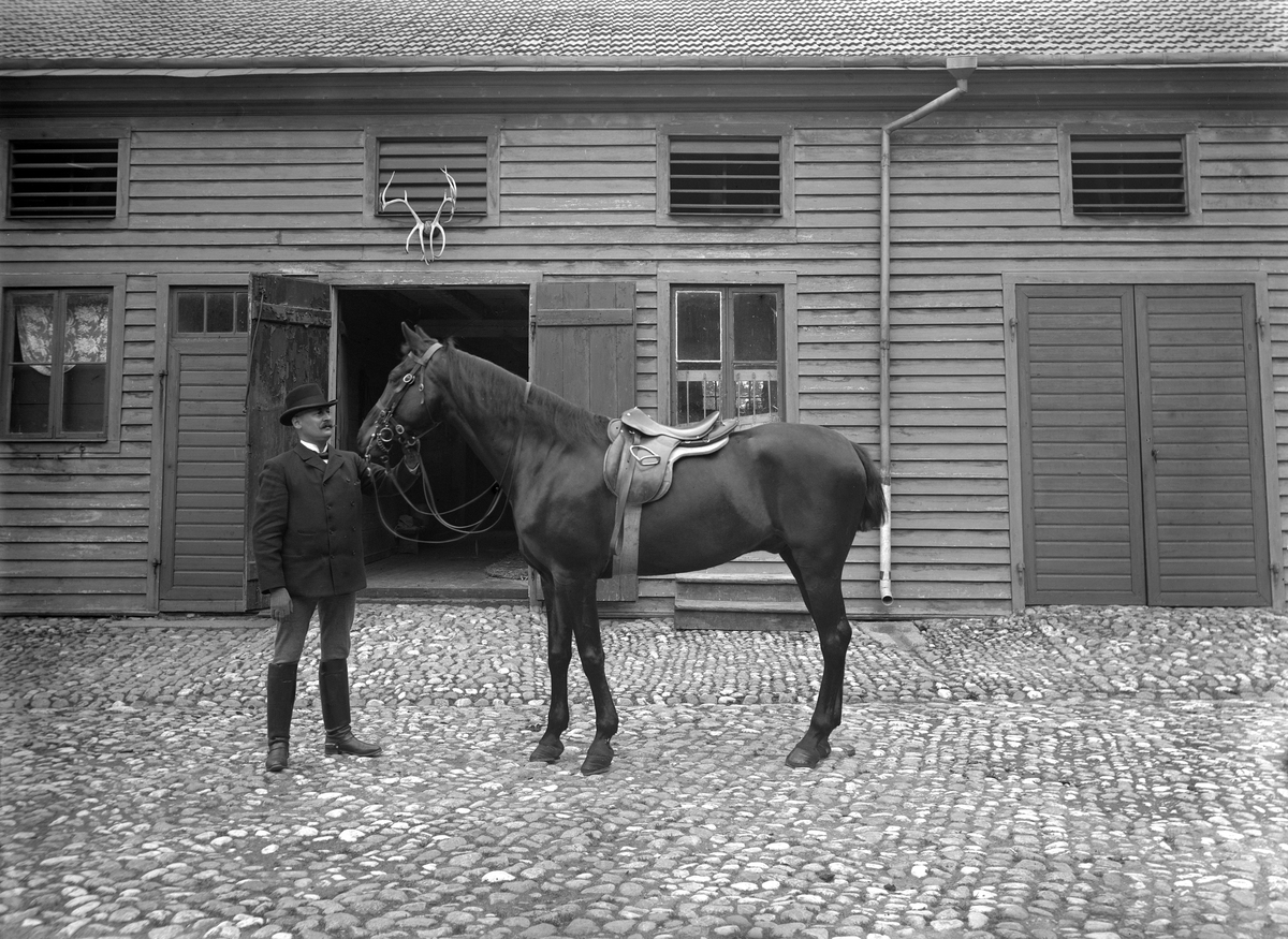 Grosshandlare John Brobeck visar stolt upp sin ridhäst invid ridhuset i hörnet av slottsträdgården till Linköpings slott.