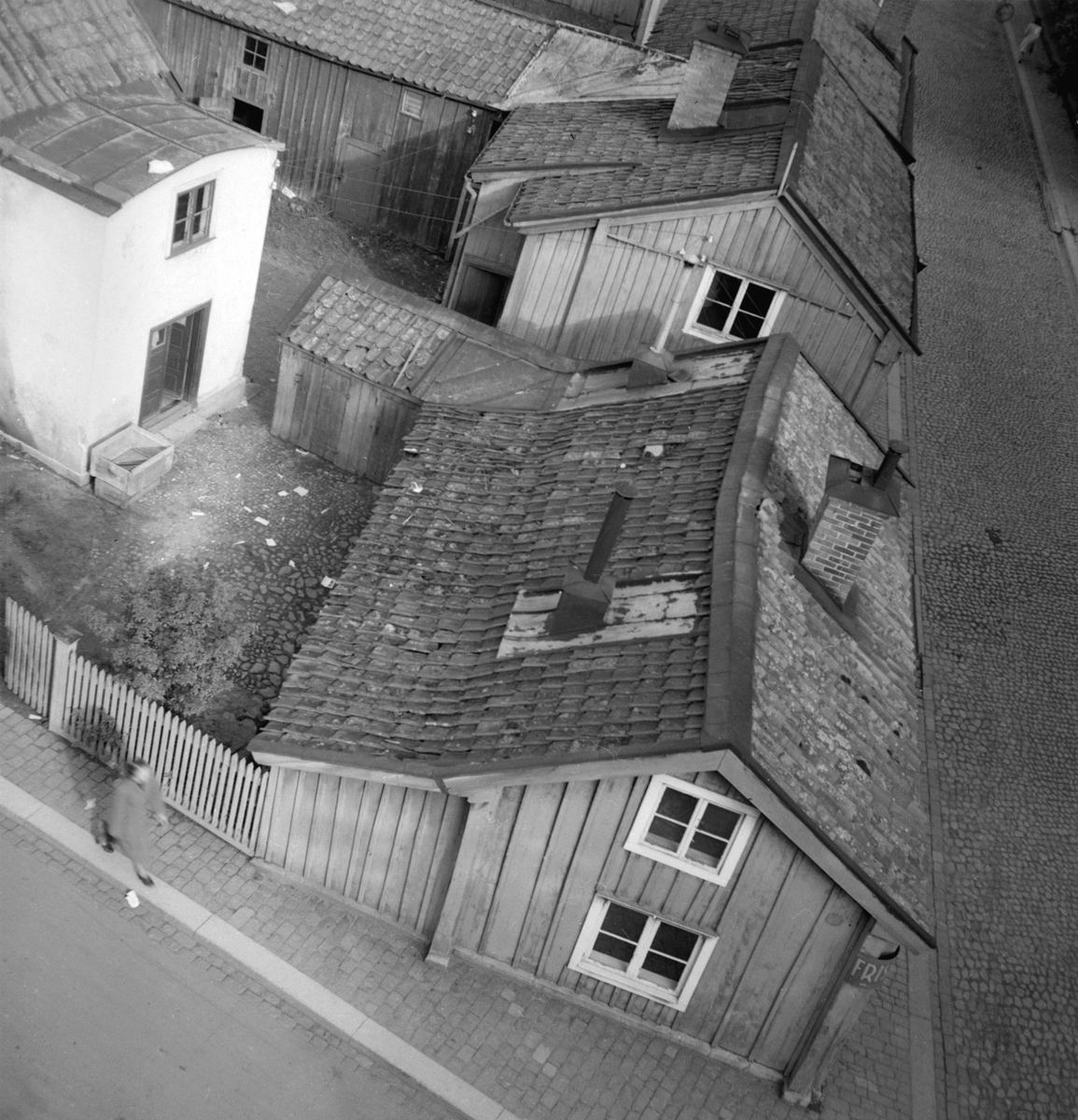 Perspektiv mot hörnet av Ågatan-Repslagaregatan i Linköping. I kvarterets sydvästra del låg gården med den äldre beteckningen S:t Lars 66. Den bestod av två bostadshus, trähuset i hörnet och det vitrappade som anas till vänster i bilden. Kvarterets hus revs 1944 för att ge plats för ett nytt polishus.