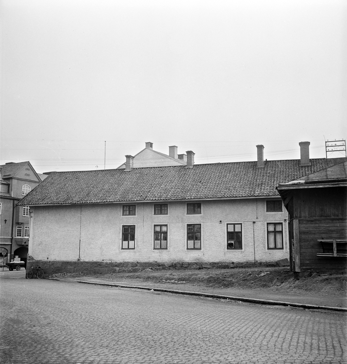 Del av kvarteret Gästgivaregården i Mjölby. Där Jerikodalsgatan och då ännu Gästgivaregatan mynnade ut mot Kungsvägen låg denna affärsbyggnad.