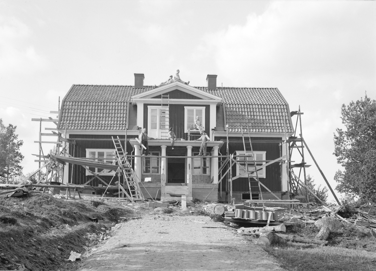 Ett nytt komministerbostället i Svinhult socken stod klart 1934. Här lägger ortens hantverkare sina sista händer vid bygget.