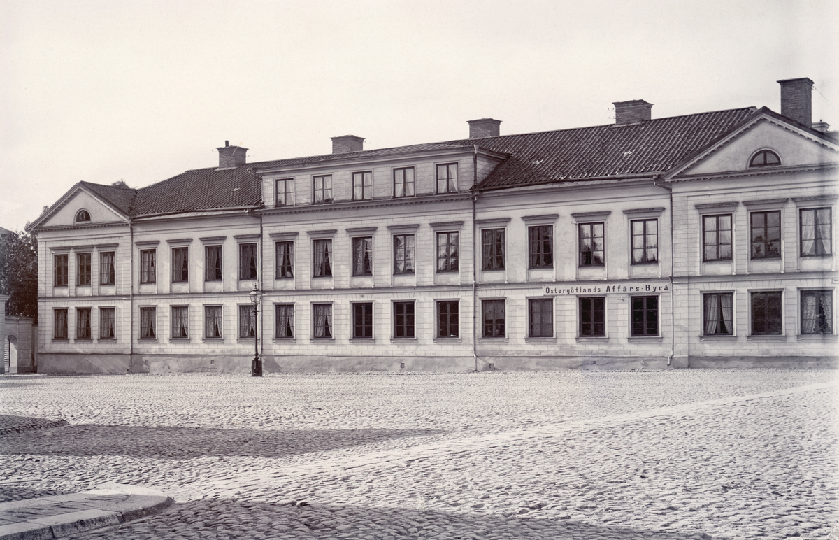 Vy mot Allardska gården eller som oftast kallad Portlösa i Linköping. Tiden är omkring 1890. Gårdens första benämningen har sin grund i affärsmannen Edvard Gustafsson, som genom sitt äktenskap med modehandlerskan Hilda Aurora Allard antog hennes efternamn. Makarna blev ägare till fastigheten år 1900. Benämningen Portlösa har huset fått efter den ursprungliga avsaknaden av entréer mot Hospitalstorget. Gården ägdes tidigare av stadens då mest ansedda och anlitade byggmästare, Jonas Jonsson. Denne lät 1857 uppföra huset och gav den ett tydligt prov på den så kallade Jonsson-empiren.