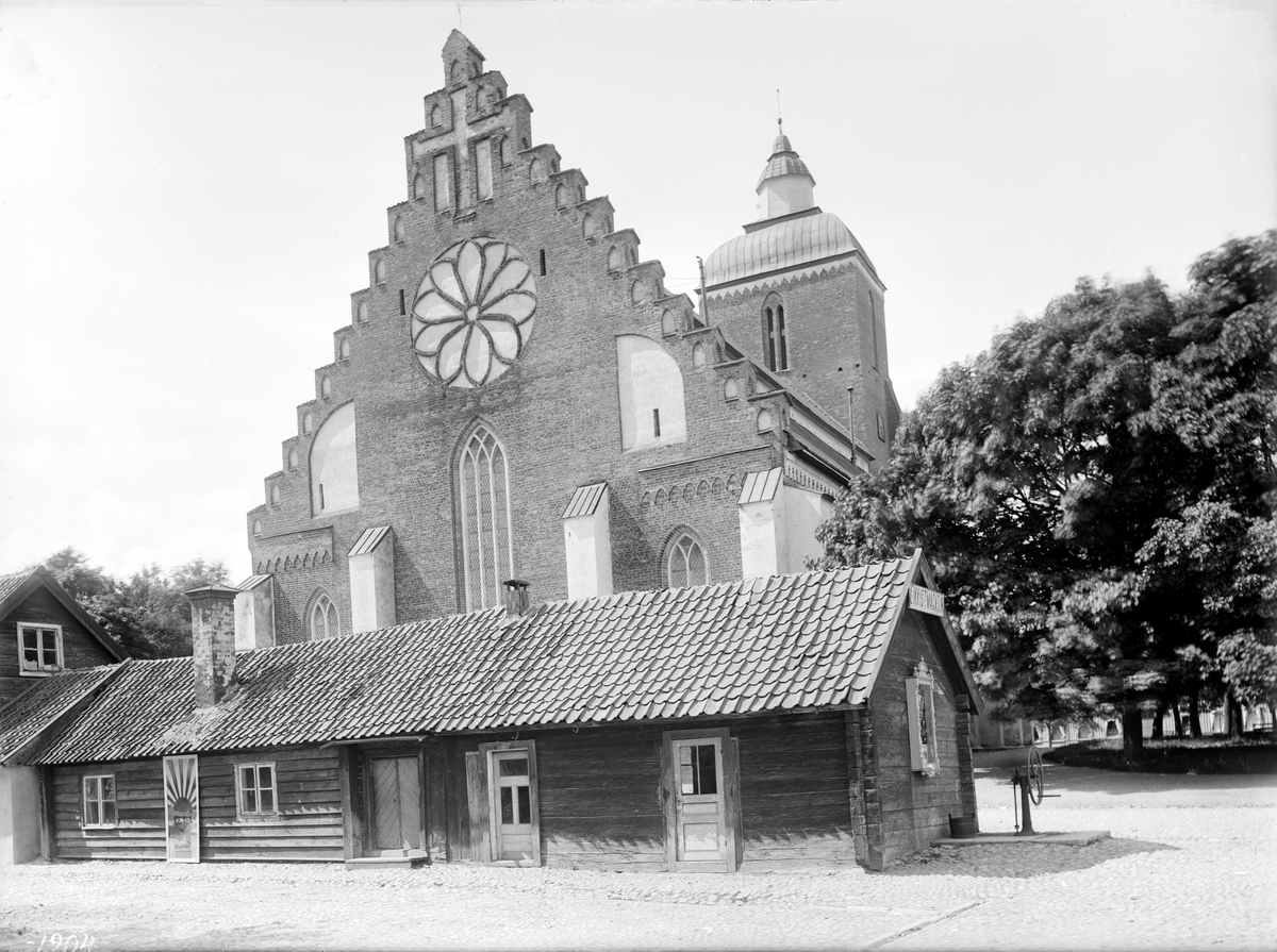 Den pampiga östfasaden döljer från fotografens perspektiv närmast den i övrigt storslagna Vårfrukyrkan i Skänninge. Kyrkan uppfördes efter tyskt mönster och invigdes i början av 1300-talet, helgad åt jungfru Maria som givit kyrkan sitt namn. För det låga trähuset i förgrunden kan inga tillfredsställande svar ges inom ramen för uppgiften. På gaveln annonseras "LIKKISTMAGASIN" och gissningsvis inrymde byggnaden bod för försäljning av just likistor. En väl placering invid kyrkan kan tyckas, även om man sedan länge upphört att begrava invid helgedomen.