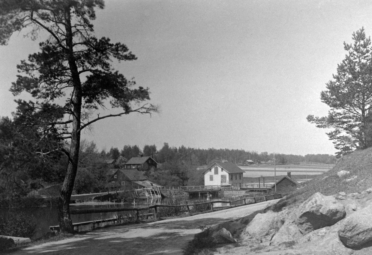 Detta grumliga repro visar miljön vid Hjulsbro kvarn och sluss 1906. Bilden är tagen i en brytningstid för området. År 1907 registreras Hjulsbro Tråddrageri & Spikfabriks AB och året därpå kommer en fabriksbyggnad stå färdig. Den gamla kvarnen, byggnaden med snedtak, rivs och mjölnarbostället på höjden byggs om till disponentbostad. Den vita byggnaden på bilden är den nya kvarnen som anlagts på motstående sida av ån.