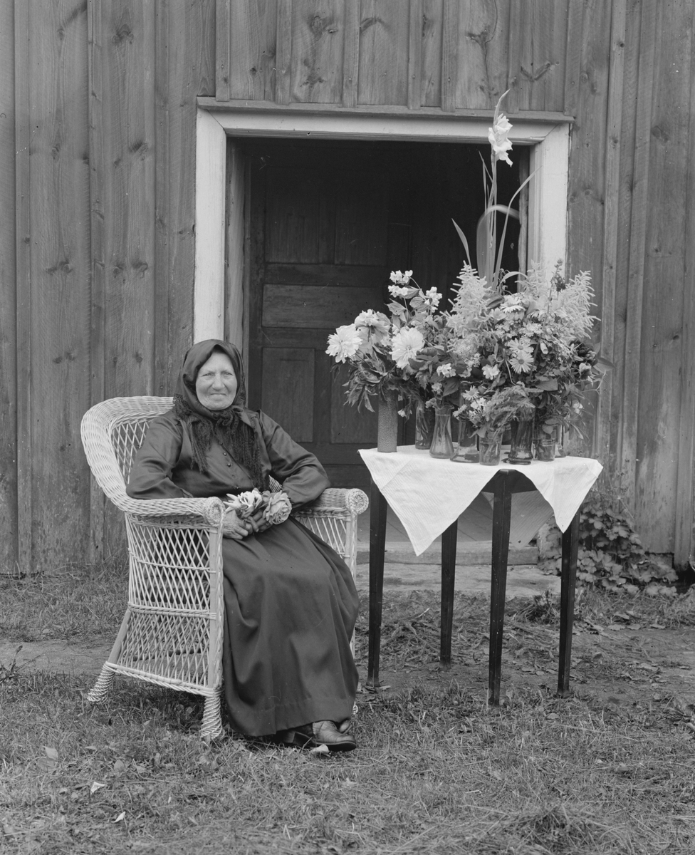Hemslöjdsidgerskan Klara Johansson utanför sin backstuga Stenstugan under Norra Bråta i Svinhult sn. Född Andersdotter gifte hon sig 1872 med torparen Johan Magnus Johansson (1839-1908). Paret kom till Stenstugan från Flodhult 1901. Stugan hade då status som torp, vilket efter makens död degraderedes till backstuga. Klara avled på Svinhuls ålderdomshem 1936.