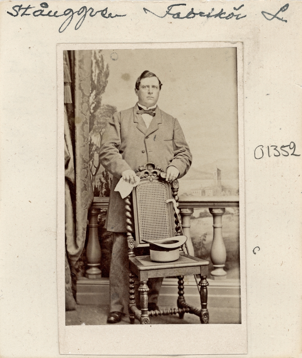 Porträtt av gaverifabrikör Adolf Stånggren. Född i Linköping 1825 som son till garvare (karduansmakare) Lars Magnus Stånggren och hustrun Anna Sofia, född Danson. Familjen bedrev sin garveriverksamhet inom nuvarande kvarteret Braxen. Från 1851 var han gift med Constance, född Holmberg.