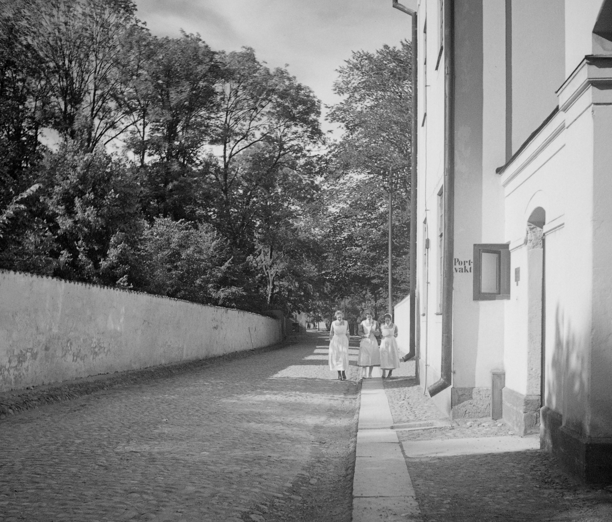 Sjuksystrar på Lastköpingsgatan i Vadstena. Rimligtvis är de på väg mot arbetet på kvinnoavdelningen vid Birgittas sjukhus, vars ingång annonseras i bildens förgrund. Möjligtvis kommer de från sjukhusets avdelning i det gamla nunneklostret i Bjälbopalatset strax intill. Året är 1933.