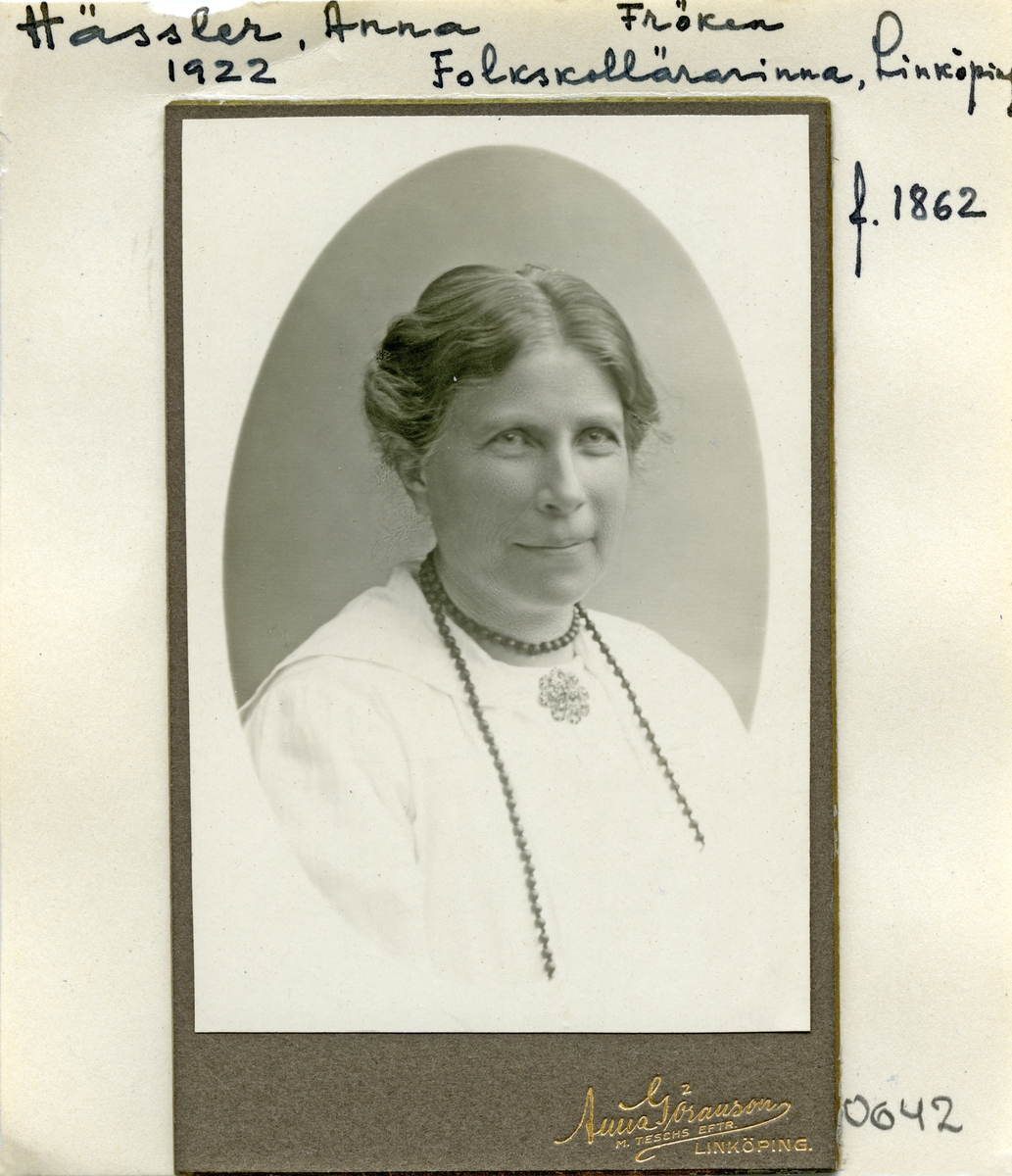 Porträtt av fröken Anna Hässler. Född i Högsby under till synes goda förutsättningar. Allt förändrades när fadern avled "vådligen genom bösskott afgående" och modern kort därefter dog av "okänd orsak", endast 30 år gammal. Där emellan hade även en bror gått bort i mässlingen. De kvarvarande syskonen skingrades och Anna kom till släktingar i Vadstena. År 1885 flyttade hon till Linköping och var där verksam som folkskollärarinna livet ut.