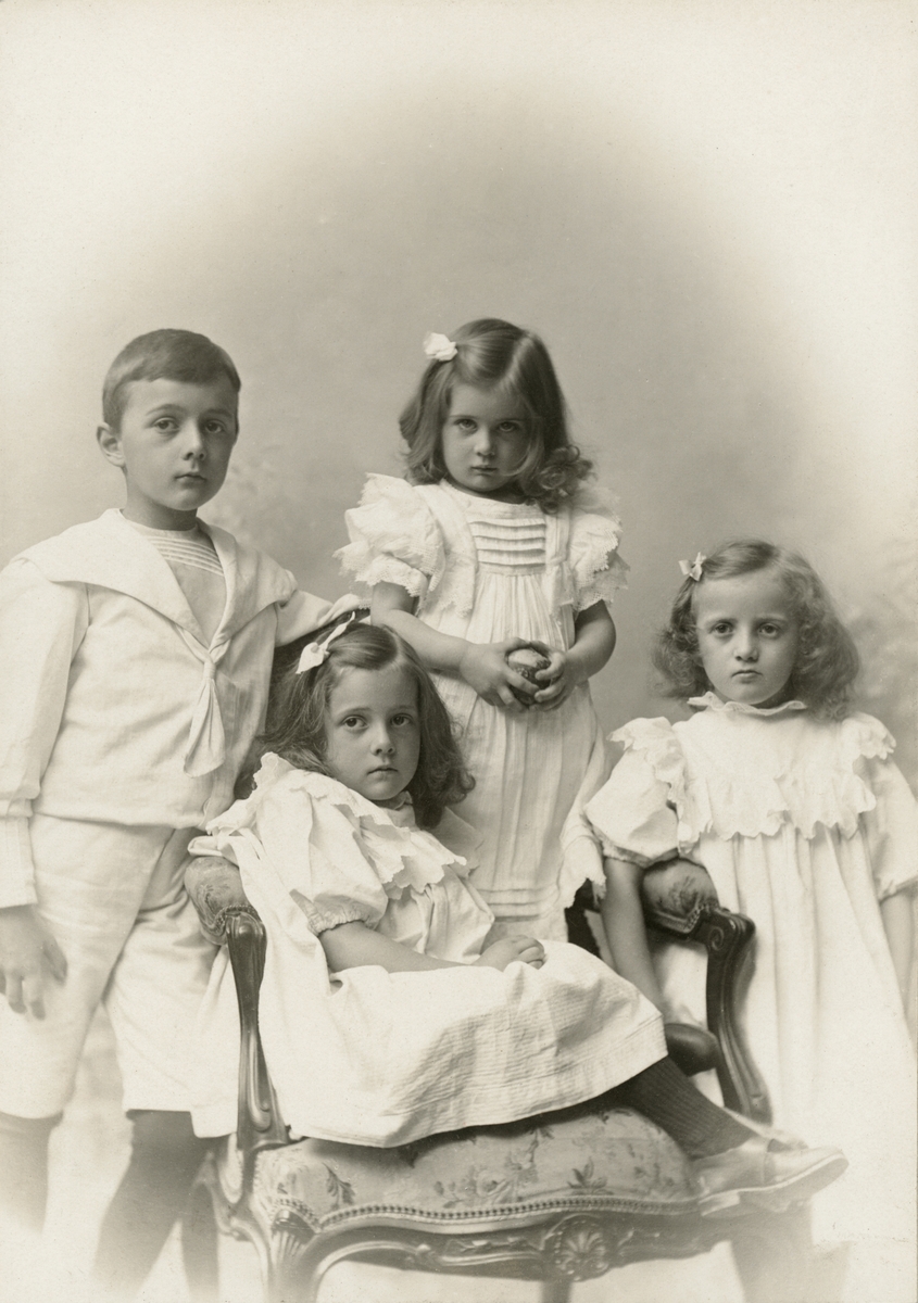 De bedårande barnen till kapten Axel Kindberg och dennes hustru Hilma, född Strandberg. Stående från vänster står Nils, Margareta och Dagmar. I karmstolen sitter Gunhild.