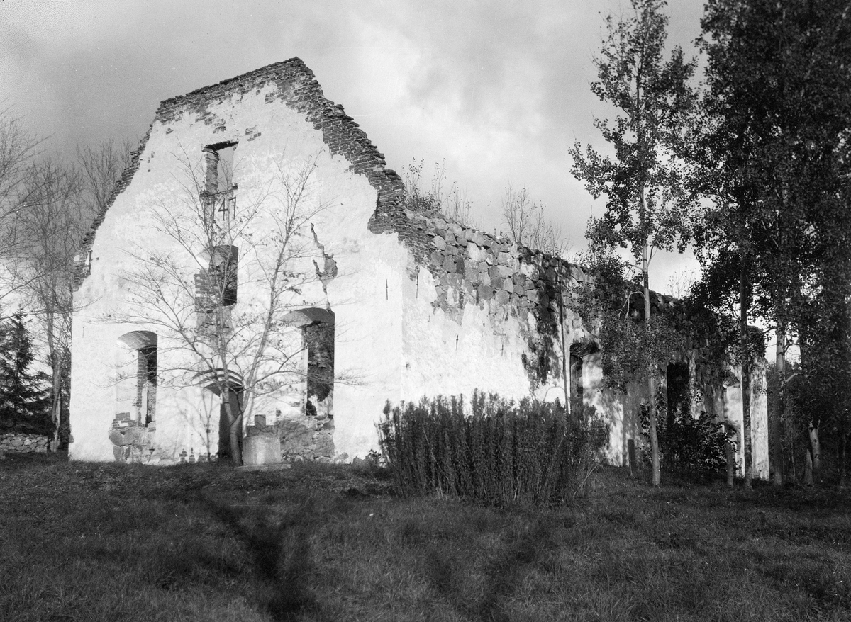 På platsen för Krokeks ödekyrka stod i äldsta tid franciskanordens kapell, omnämnt år 1440. Vid reformationen drogs klostret in och kapellet kom vidare att ersättas med den så kallade Gunillakyrkan, tillkommen genom drottning Gunillas försorg. Under 1600- och 1700-talens lopp förföll kyrkan och vid 1740-talet fattades beslut om att uppföra bildens kyrkobyggnad. Den stod klar för bruk år 1747. Men inte heller denna byggnad kom att bestå. Söndagen den 28 april 1889 drabbades kyrkan av en våldsam brand som förstörde byggnaden bortom möjlig återuppbyggnad. I omgångar har ruinen monterats ned och idag består den av meterhöga grundmurar. Bilden har lämnat oss odaterad men kan genom ruinens yttre tecken uppskattas till tiden omkring 1920.