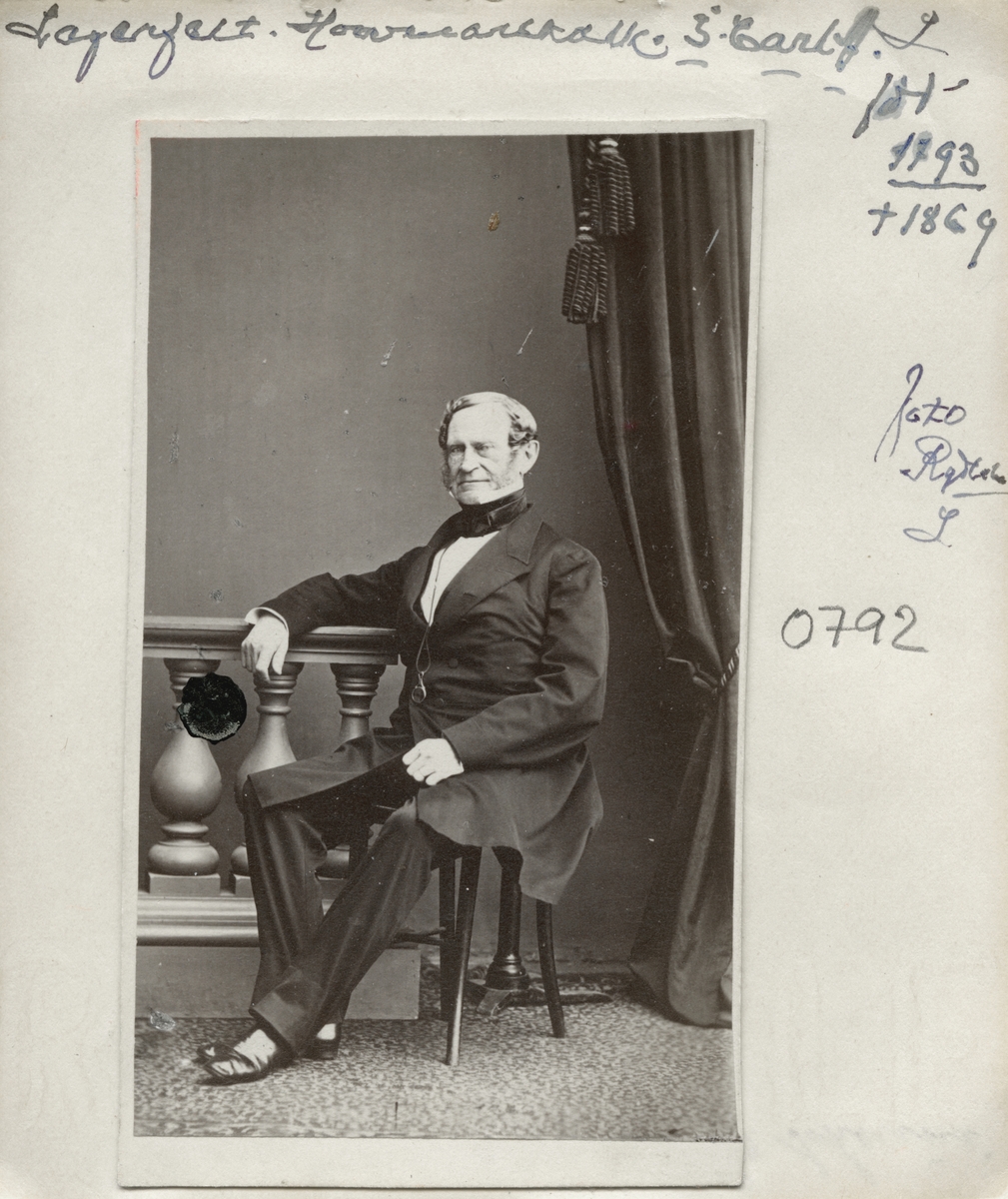 Porträtt av friherre Carl Lagerfelt. Efter hovrättsexamen 1811 kom han att inneha en rad tjänster vid hovet. Från 1827 hovmarskalk hos prinsessan Sofia Albertina. Efter faderns bortgång 1821 hade han blivit ägare av familjeegendomen Lagerlunda i Kärna. Inom sin hemort var han intensivt verksam i närings- och föreningslivet. Bland annat stiftare av Östergötlands läns branstodsbolag och länge ledamot i länets hushållningssällskap. Från 1828 gift med sin kusin, grevinnan Lovisa Wachtmeister.